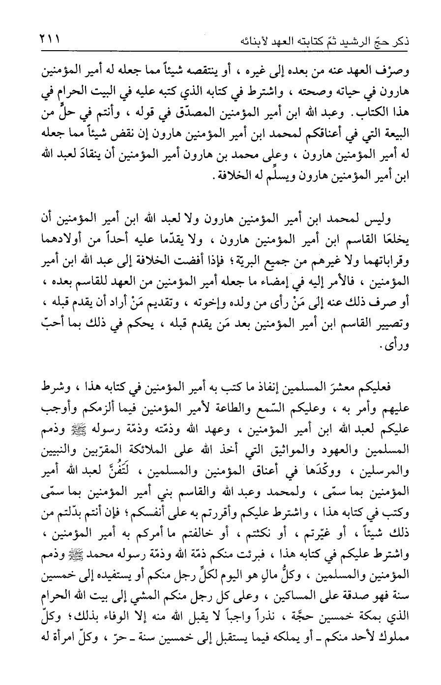 وصرْف العهد عنه من بعده إلى غيره، أو ينتقصه شيئًا مما جعله له أمير المؤمنين هارون في حياته وصحته، واشترط في كتابه الذي كتبه عليه في البيت الحرام في هذا الكتاب. وعبد الله ابن أمير المؤمنين المصدّق في قوله، وأنتم في حلٍّ من البيعة التي في أعناقكم لمحمد ابن أمير المؤمنين هارون إن نقض شيئًا مما جعله له أمير المؤمنين هارون، وعلى محمد بن هارون أمير المؤمنين أن ينقادَ لعبد الله ابن أمير المؤمنين هارون ويسلِّم له الخلافة.