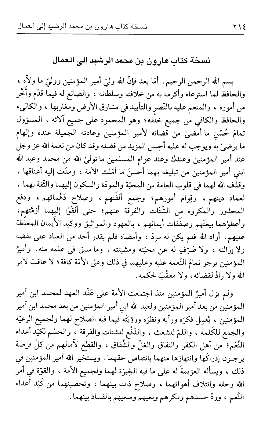 بسم الله الرحمن الرحيم. أمّا بعد فإنّ الله وليّ أمير المؤمنين ووليّ ما ولّاه، والحافظ لما استرعاه وأكرمه به من خلافته وسلطانه، والصانع له فيما قدّم وأَخَّر من أموره، والمنعم عليه بالنّصر والتأييد في مشارق الأرض ومغاربها، والكالئ والحافظ والكافي من جميع خلْقه؛ وهو المحمود على جميع آلائه، المسؤول تمامَ حُسْنِ ما أمضى من قضائه لأمير المؤمنين وعادته الجميلة عنده وإلهام ما يرضى به ويوجب له عليه أحسن المزيد من فضله وقد كان من نعمة الله عز وجل عند أمير المؤمنين وعندك وعند عوام المسلمين ما تولى الله من محمد وعبد الله ابني أمير المؤمنين من تبليغه بهما أحسنَ ما أمّلت الأمة، ومدّت إليه أعناقها، وقذف الله لهما في قلوب العامة من المحبّة والمودّة والسكون إليهما والثّقة بهما، لعماد دينهم، وقوام أمورهم؛ وجمع ألفَتهم، وصلاح دَهْمائهم، ودفع المحذور والمكروه من الشّتَات والفرقة عنهم؛ حتى ألقَوْا إليهما أزمَّتهم، وأعطوْهما بيعتَهم وصفَقات أيمانهم، بالعهود والمواثيق ووكيد الأَيمان المغلّظة عليهم. أراد الله فلم يكن له مردّ، وأمضاه فلم يقدر أحد من العباد على نقضه ولا إزالته، ولا صَرْفٍ له عن محبّته ومشيئته، وما سبق في علمه منه. وأميرُ المؤمنين يرجو تمامَ النّعمة عليه وعليهما في ذلك وعلى الأمّة كافة؛ لا عاقبَ لأمر الله ولا رادَّ لقضائه، ولا معقِّبَ لحكمه.