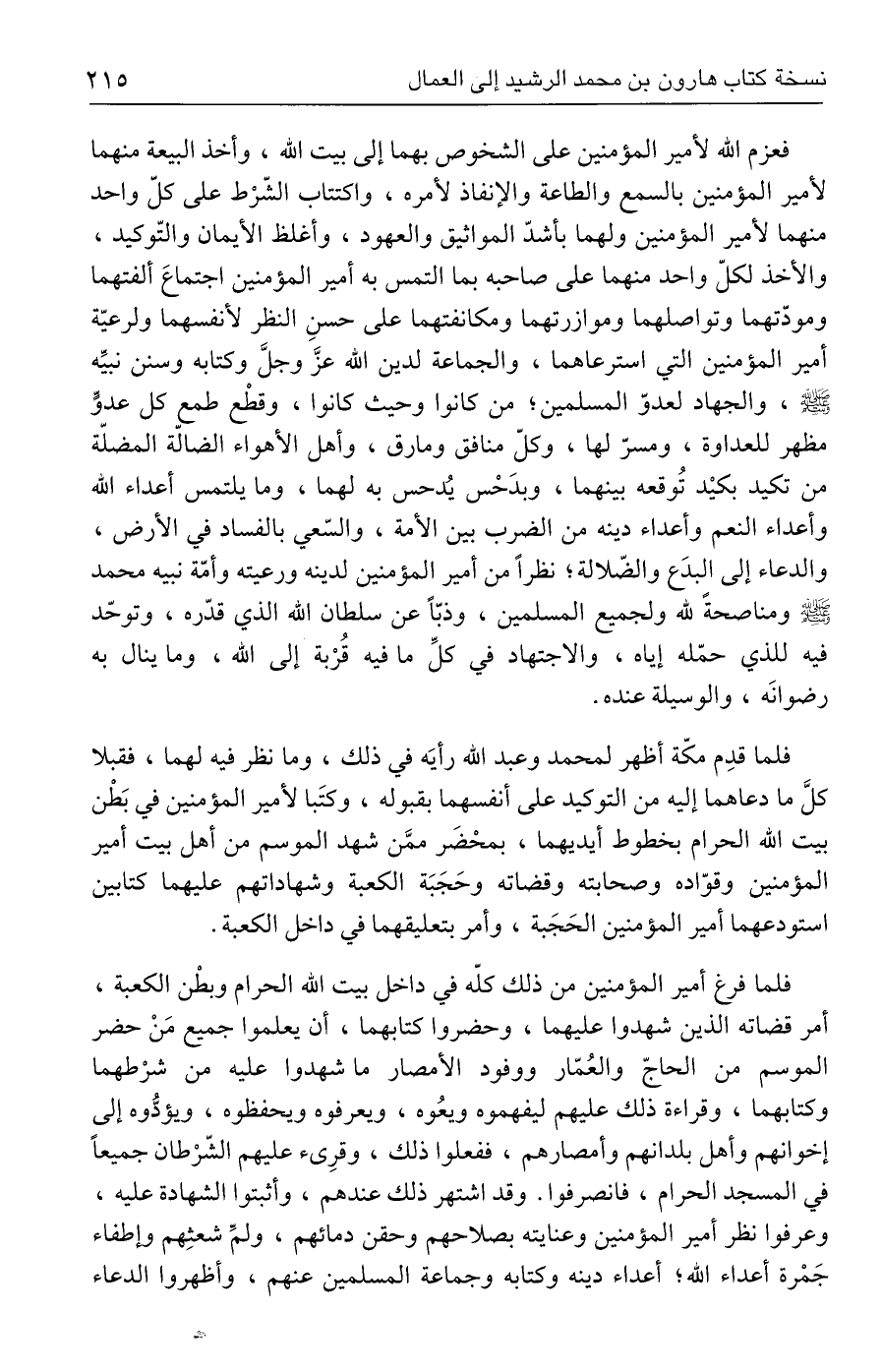 فعزم الله لأمير المؤمنين على الشخوص بهما إلى بيت الله، وأخذ البيعة منهما لأمير المؤمنين بالسمع والطاعة والإنفاذ لأمره، واكتتاب الشّرْط على كلّ واحد منهما لأمير المؤمنين ولهما بأشدّ المواثيق والعهود، وأغلظ الأيمان والتّوكيد، والأخذ لكلّ واحد منهما على صاحبه بما التمس به أمير المؤمنين اجتماعَ ألفتهما ومودّتهما وتواصلهما وموازرتهما ومكانفتهما على حسنِ النظر لأنفسهما ولرعيّة أمير المؤمنين التي استرعاهما، والجماعة لدين الله عزَّ وجلَّ وكتابه وسنن نبيِّه - صلى الله عليه وسلم -، والجهاد لعدوّ المسلمين؛ من كانوا وحيث كانوا، وقطْع طمع كل عدوٍّ مظهر للعداوة، ومسرّ لها، وكلّ منافق ومارق، وأهل الأهواء الضالّة المضلّة من تكيد بكيْد تُوقعه بينهما، وبدَحْس يُدحس به لهما، وما يلتمس أعداء الله وأعداء النعم وأعداء دينه من الضرب بين الأمة، والسّعي بالفساد في الأرض، والدعاء إلى البدَع والضّلالة؛ نظرًا من أمير المؤمنين لدينه ورعيته وأمّة نبيه محمد - صلى الله عليه وسلم - ومناصحةً لله ولجميع المسلمين، وذبًّا عن سلطان الله الذي قدّره، وتوحّد فيه للذي حمّله إياه، والاجتهاد في كلِّ ما فيه قُرْبة إلى الله، وما ينال به رضوانَه، والوسيلة عنده.