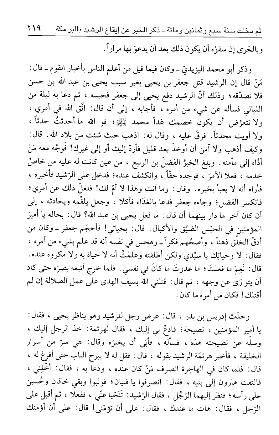وذكر أبو محمد اليزيديّ - وكان فيما قيل من أعلم الناس بأخبار القوم - قال: مَنْ قال إن الرشيد قتل جعفر بن يحيى بغير سبب يحيى بن عبد الله - بن حسن فلا تصدّقه؛ وذلك أنّ الرشيد دفع يحيى إلى جعفر فحبسه، ثم دعا به ليلة من الليالي فسأله عن شيء من أمره، فأجابه، إلى أن قال: اتَّق الله في أمري، ولا تتعرَّض أن يكون خصمك غدًا محمد - صلى الله عليه وسلم -؛ فولله ما أحدثتُ حدثًا، ولا أويت محدثًا. فرقّ عليه، وقال له: اذهب حيث شئت من بلاد الله. قال: وكيف أذهب ولا آمن أن أوخذَ بعد قليل فأردّ إليك أو إلى غيرك! فَوجّه معه مَنْ أدَّاه إلى مأمنه. وبلغ الخبرُ الفضلَ بن الربيع، من عين كانت له عليه من خاصِّ خدمه، فعلا الأمرَ، فوجده حقًّا، وانكشف عنده؛ فدخل على الرّشيد فأخبره، فأراه أنه لا يعبأ بخبره. وقال: وما أنت وهذا لا أمّ لك! فلعلّ ذلك عن أمري؛ فانكسر الفضل؛ وجاءه جعفر فدعا بالغدَاء فأكلا، وجعل يلقِّمه ويحادثه، إلى أن كان آخر ما دار بينهما أن قال: ما فعل يحيى بن عبد الله؟ قال: بحاله يا أميرَ المؤمنين في الحبْس الضيِّق والأكبال. قال: بحياتي! فأحجَم جعفر - وكان من أدقّ الخلْق ذهنًا، وأصحِّهم فكرًا - وهجس في نفسه أنه قد علم بشيء من أمره، فقال: لا وحياتِك يا سيِّدي ولكن أطلقته وعلمْتُ أنه لا حياة به ولا مكروه عنده. قال: نَعِمَ ما فعلتَ؛ ما عدوتَ ما كانَ في نفسي. فلما خرج أتبعه بصرَه حتى كاد أن يتوارَى عن وجهه، ثم قال: قتلني الله بسيف الهدى على عمل الضلالة إن لم أقتلك! فكان من أمره ما كان.