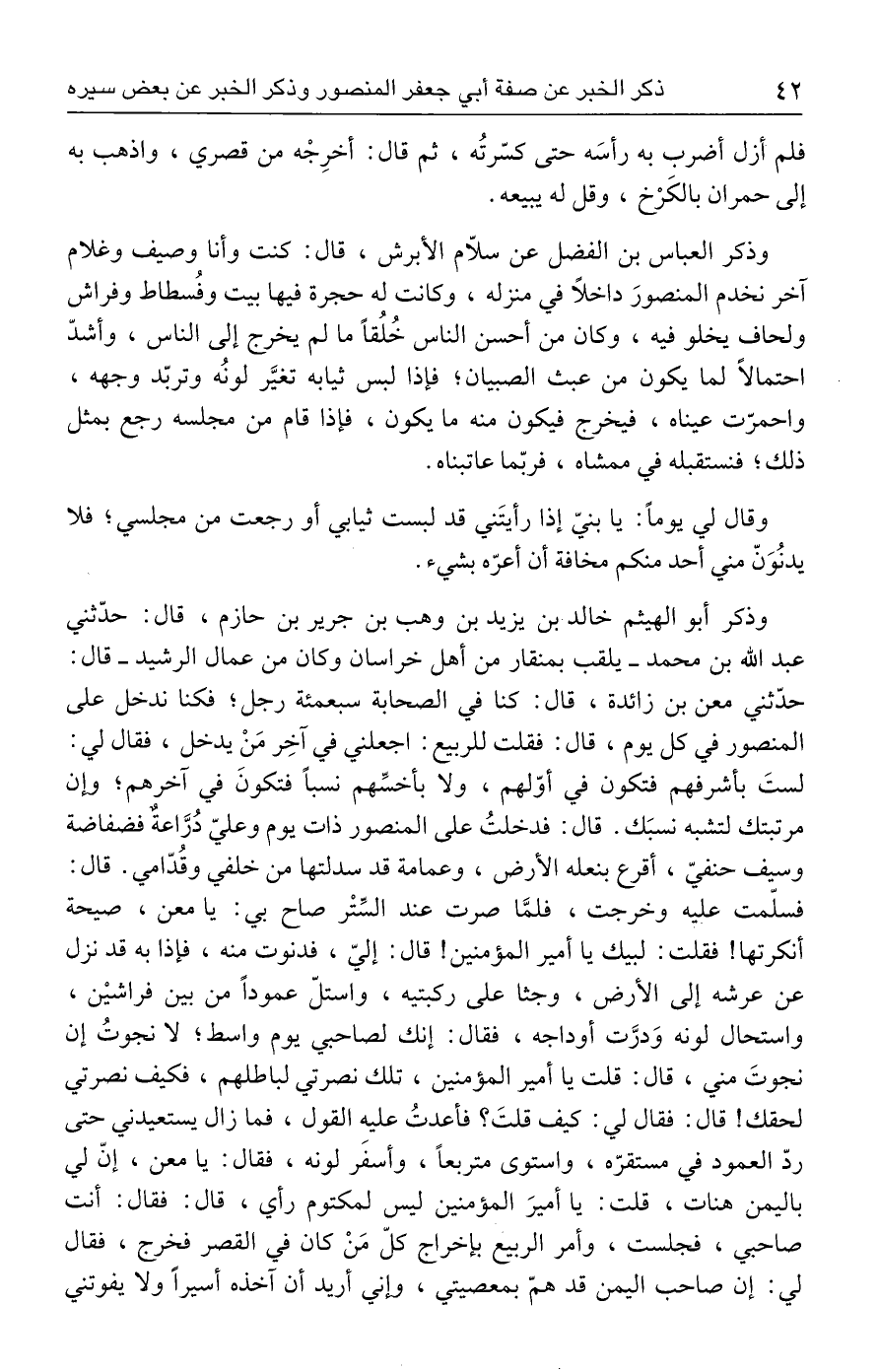 وذكر العباس بن الفضل عن سلّام الأبرش، قال: كنت وأنا وصيف وغلام آخر نخدم المنصورَ داخلًا في منزله، وكانت له حجرة فيها بيت وفُسطاط وفراش ولحاف يخلو فيه، وكان من أحسن النَّاس خُلُقًا ما لم يخرج إلى النَّاس، وأشدّ احتمالًا لما يكون من عبث الصبيان؛ فإذا لبس ثيابه تغيَّر لونُه وتربّد وجهه، واحمرّت عيناه، فيخرج فيكون منه ما يكون، فإذا قام من مجلسه رجع بمثل ذلك؛ فنستقبله في ممشاه، فربّما عاتبناه.