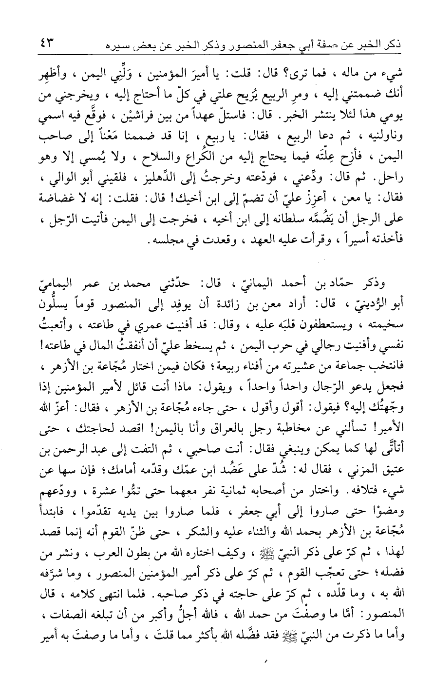 شيء من ماله، فما ترى؟ قال: قلت: يا أميرَ المؤمنين، وَلِّنِي اليمن، وأظهِر أنك ضممتني إليه، ومرِ الرَّبيع يُزيح علتي في كلّ ما أحتاج إليه، ويخرجني من يومي هذا لئلا ينتشر الخبر. قال: فاستلّ عهدًا من بين فراشيْن، فوقَّع فيه اسمي وناولنيه، ثم دعا الرَّبيع، فقال: يا ربيع، إنا قد ضممنا مَعْنًا إلى صاحب اليمن، فأزح عِلّتَه فيما يحتاج إليه من الكُراع والسلاح، ولا يُمسي إلَّا وهو راحل. ثم قال: ودِّعني، فودّعته وخرجتُ إلى الدِّهليز، فلقيني أبو الوالي، فقال: يا معن، أعزِزْ عليّ أن تضمّ إلى ابن أخيك! قال: فقلت: إنَّه لا غضاضة على الرجل أن يَضُمَّه سلطانه إلى ابن أخيه، فخرجت إلى اليمن فأتيت الرّجل، فأخذته أسيرًا، وقرأت عليه العهد، وقعدت في مجلسه.