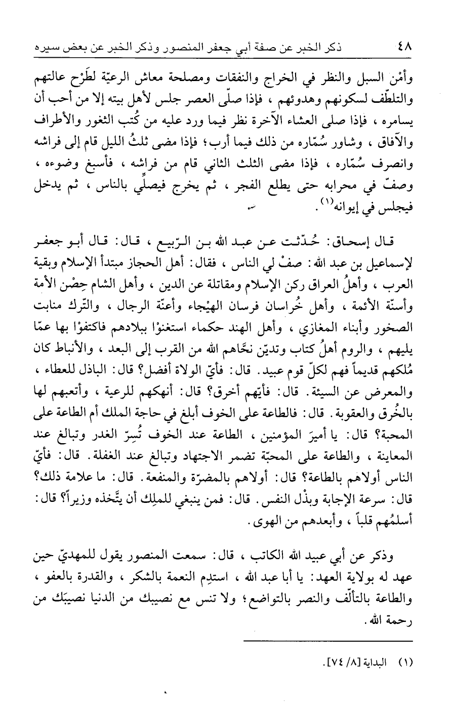 قال إسحاق: حُدّثت عن عبد الله بن الرّبيع، قال: قال أبو جعفر لإسماعيل بن عبد الله: صفْ لي النَّاس، فقال: أهل الحجاز مبتدأ الإسلام وبقية العرب، وأهلُ العراق ركن الإسلام ومقاتلة عن الدين، وأهل الشَّام حِصْن الأمة وأسنّة الأئمة، وأهل خُراسان فرسان الهيْجاء وأعنّة الرجال، والتّرك منابت الصخور وأبناء المغازي، وأهل الهند حكماء استغنوْا ببلادهم فاكتفوْا بها عمّا يليهم، والروم أهلُ كتاب وتديّن نحَّاهم الله من القرب إلى البعد، والأنباط كان مُلكهم قديمًا فهم لكلّ قوم عبيد. قال: فأيّ الولاة أفضل؟ قال: الباذل للعطاء، والمعرض عن السيئة. قال: فأيّهم أخرق؟ قال: أنهكهم للرعية، وأتعبهم لها بالخُرق والعقوبة. قال: فالطاعة على الخوف أبلغ في حاجة الملك أم الطاعة على المحبة؟ قال: يا أميرَ المؤمنين، الطاعة عند الخوف تُسِرّ الغدر وتبالغ عند المعاينة، والطاعة على المحبّة تضمر الاجتهاد وتبالغ عند الغفلة. قال: فأيّ النَّاس أولاهم بالطاعة؟ قال: أولاهم بالمضرّة والمنفعة. قال: ما علامة ذلك؟ قال: سرعة الإجابة وبذْل النَّفس. قال: فمن ينبغي للملِك أن يتَّخذه وزيرًا؟ قال: أسلمُهم قلبًا، وأبعدهم من الهوى.