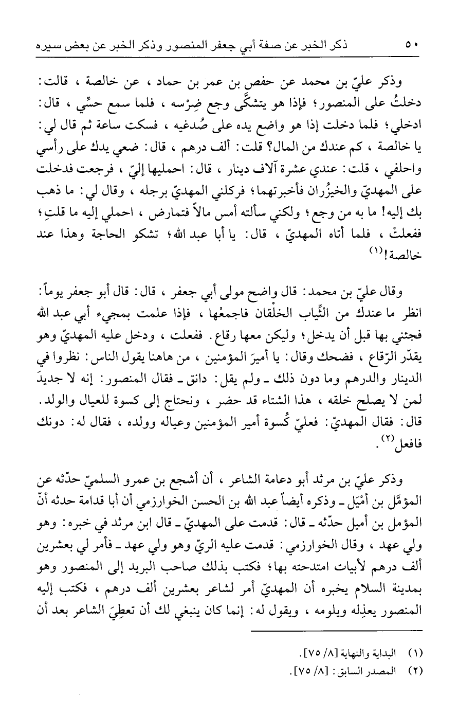 وذكر عليّ بن محمَّد عن حفص بن عمر بن حماد، عن خالصة، قالت: دخلتُ على المنصور؛ فإذا هو يتشكَّى وجع ضِرْسه، فلما سمع حسِّي، قال: ادخلي؛ فلما دخلت إذا هو واضع يده على صُدغيه، فسكت ساعة ثم قال لي: يا خالصة، كم عندك من المال؟ قلت: ألف درهم، قال: ضعي يدلّ على رأسي واحلفي، قلت: عندي عشرة آلاف دينار، قال: احمليها إليّ، فرجعت فدخلت على المهديّ والخيزُران فأخبرتهما؛ فركلني المهديّ برجله، وقال لي: ما ذهب بك إليه! ما به من وجع؛ ولكني سألته أمس مالًا فتمارض، احملي إليه ما قلتِ؛ ففعلتْ، فلما أتاه المهديّ، قال: يا أبا عبد الله؛ تشكو الحاجة وهذا عند خالصة! (١)