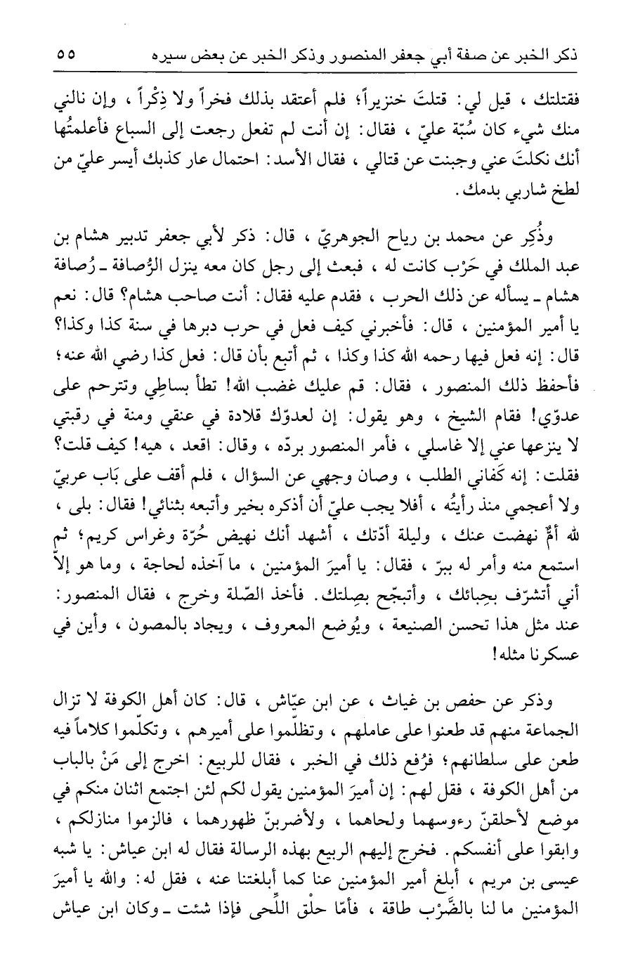 وذُكِر عن محمَّد بن رياح الجوهريّ، قال: ذكر لأبي جعفر تدبير هشام بن عبد الملك في حَرْب كانت له، فبعث إلى رجل كان معه ينزل الرُّصافة - رُصافة هشام - يسأله عن ذلك الحرب، فقدم عليه فقال: أنت صاحب هشام؟ قال: نعم يا أمير المؤمنين، قال: فأخبرني كيف فعل في حرب دبرها في سنة كذا وكذا؟ قال: إنَّه فعل فيها رحمه الله كذا وكذا، ثم أتبع بأن قال: فعل كذا رضي الله عنه؛ فأحفظ ذلك المنصور، فقال: قم عليك غضب الله! تطأ بساطِي وتترحم على عدوّي! فقام الشَّيخ، وهو يقول: إن لعدوّك زيادة في عنقي ومنة في رقبتي لا ينزعها عني إلَّا غاسلي، فأمر المنصور بردّه، وقال: اقعد، هيه! كيف قلت؟ فقلت: إنَّه كَفاني المطلب، وصان وجهي عن السؤال، فلم أقف على بَاب عربيّ ولا أعجمي منذ رأيتُه، أفلا يجب عليّ أن أذكره بخير وأتبعه بثنائي! فقال: بلى، لله أمٌّ نهضت عنك، وليلة أدّتك، أشهد أنك نهيض حُرّة وغراس كريم؛ ثم استمع منه وأمر له ببرّ، فقال: يا أميرَ المؤمنين، ما آخذه لحاجة، وما هو إلَّا أني أتشرّف بحِبائك، وأتبجّح بصِلتك. فأخذ الصّلة وخرج، فقال المنصور: عند مثل هذا تحسن الصنيعة، ويُوضع المعروف، ويجاد بالمصون، وأين في عسكرنا مثله!