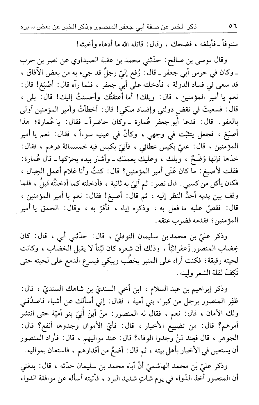 وذكر عليّ بن محمَّد الهاشميّ أنّ أباه محمَّد بن سليمان حدّثه، قال: بلغني أن المنصور أخذ الدّواء في يوم شاتٍ شديد البرد، فأتيته أسأله عن موافقة الدواء