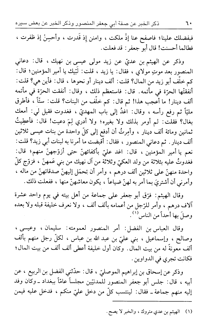 وقال الهيثم: فرّق أبو جعفر على جماعة من أهل بيته في يوم واحد عشرة آلاف درهم، وأمر للرّجل من أعمامه بألف ألف، ولا نعرف خليفة قبله ولا بعده وصلَ بها أحدًا من النَّاس (١).