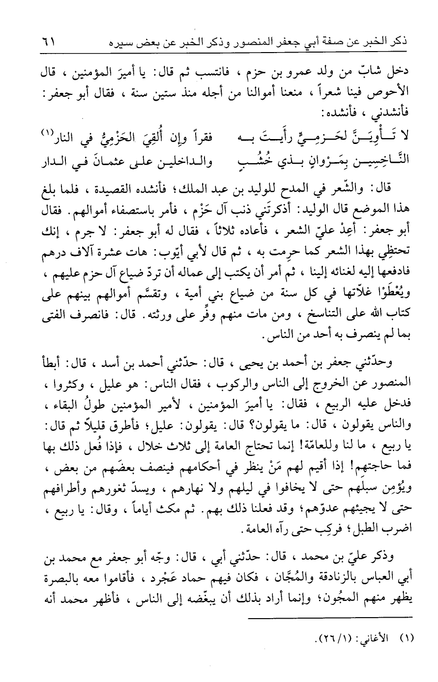 قال: والشّعر في المدح للوليد بن عبد الملك؛ فأنشده القصيدة، فلما بلغ هذا الموضع قال الوليد: أذكرتَني ذنب آل حَزْم، فأمر باستصفاء أموالهم. فقال أبو جعفر: أعِدْ عليّ الشعر، فأعاده ثلاثًا، فقال له أبو جعفر: لا جرم، إنك تحتظِي بهذا الشعر كما حرِمت به، ثم قال لأبي أيّوب: هات عشرة آلاف درهم فادفعها إليه لغنائه إلينا، ثم أمر أن يكتب إلى عمالة أن تردّ ضياع آل حزم عليهم، ويُعْطَوْا غلّاتها في كل سنة من ضياع بني أميَّة، وتقسَّم أموالهم بينهم على كتاب الله على التناسخ، ومن مات منهم وفِّر على ورثته. قال: فانصرف الفتى بما لم ينصرف به أحد من النَّاس.