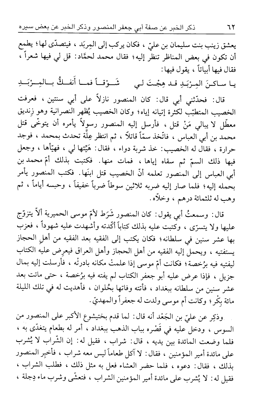 قال: وسمعتُ أبي يقول: كان المنصور شَرط لأمّ موسى الحميرية ألّا يتزوّج عليها ولا يتسرّى، وكتبت عليه بذلك كتابًا أكّدته وأشهدت عليه شهودًا، فعزب بها عشر سنين في سلطانه؛ فكان يكتب إلى الفقيه بعد الفقيه من أهلِ الحجاز يستفتيه، ويحمل إليه الفقيه من أهل الحجاز وأهل العراق فيعرِض عليه الكتاب ليفتيه فيه برُخصة؛ فكانت أمّ موسى إذا علمتْ مكانه بادرتْه، فأرسلت إليه بمال جزيل، فإذا عرض عليه أبو جعفر الكتاب لم يفته فيه برُخصة، حتَّى ماتت بعد عشر سنين من سلطانه ببغداد، فأتته وفاتها بحُلوان، فأهديت له في تلك الليلة مائة بِكْر؛ وكانت أم موسى ولدت له جعفرًا والمهديّ.