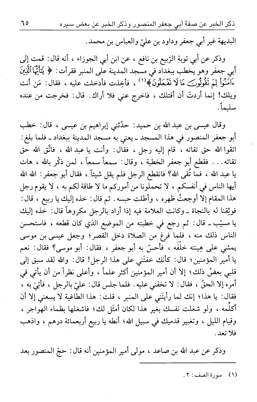 وذكر عن أبي توبة الرّبيع بن نافع، عن ابن أبي الجوزاء، أنَّه قال: قمت إلى أبي جعفر وهو يخطب ببغداد في مسجد المدينة على المنبر فقرأت: {يَاأَيُّهَا الَّذِينَ آمَنُوا لِمَ تَقُولُونَ مَا لَا تَفْعَلُونَ} (١)، فأخِذت فأدخلت عليه، فقال: مَن أنت ويلك! إنما أردتَ أن أقتلك، فأخرج عني فلا أراك. قال: فخرجت من عنده سليمًا.