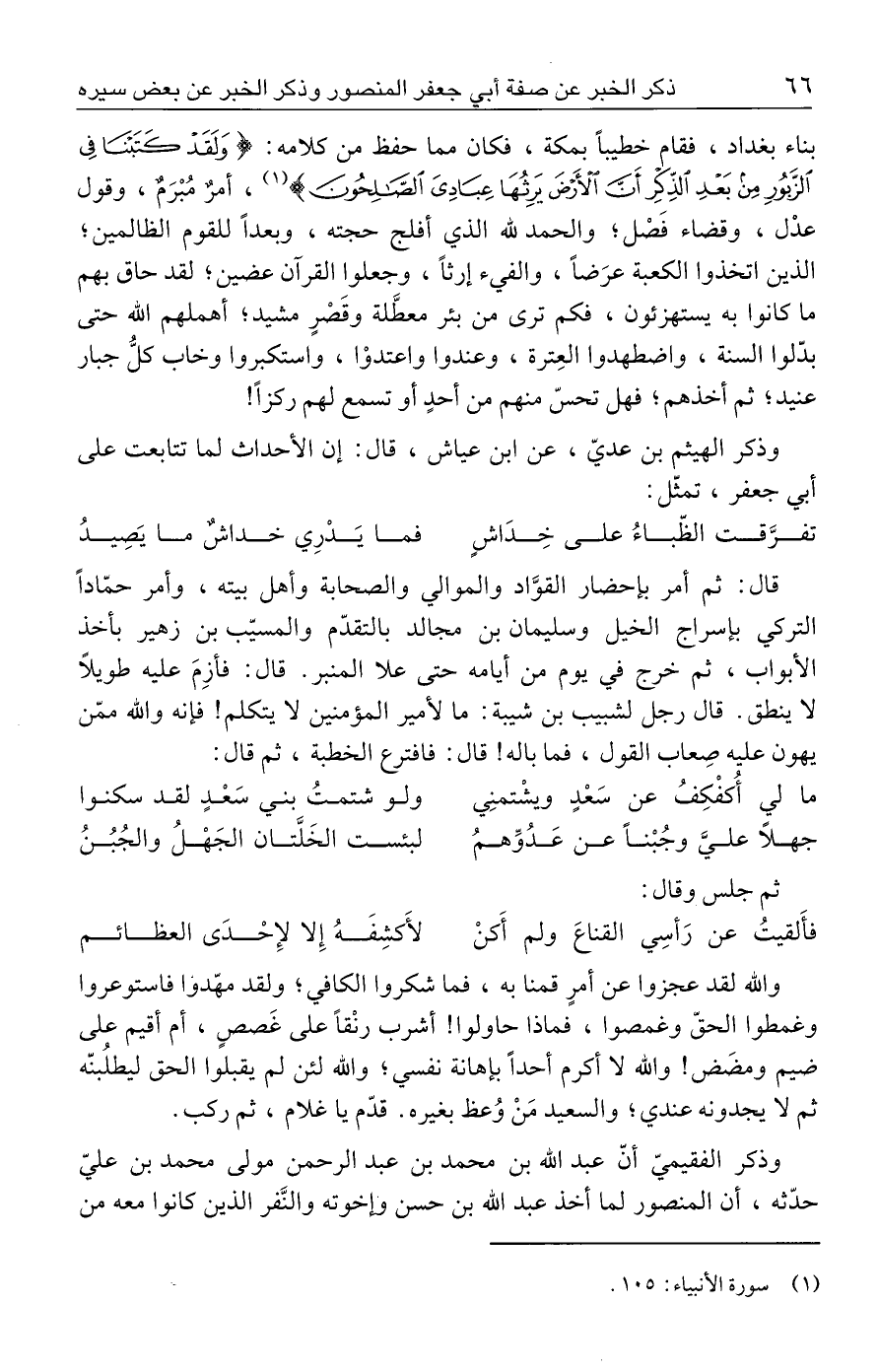بناء بغداد، فقام خطيبًا بمكة، فكان مما حفظ من كلامه: {وَلَقَدْ كَتَبْنَا فِي الزَّبُورِ مِنْ بَعْدِ الذِّكْرِ أَنَّ الْأَرْضَ يَرِثُهَا عِبَادِيَ الصَّالِحُونَ} (١)، أمرٌ مُبْرَمٌ، وقول عدْل، وقضاء فَصْل؛ والحمد لله الذي أفلج حجته، وبعدًا للقوم الظالمين؛ الذين اتخذوا الكعبة عرَضًا، والفيء إرثًا، وجعلوا القرآن عضين؛ لقد حاق بهم ما كانوا به يستهزئون، فكم ترى من بئر معطَّلة وقَصْرٍ مشيد؛ أهملهم الله حتَّى بدّلوا السنة، واضطهدوا العِترة، وعندوا واعتدوْا، واستكبروا وخاب كلُّ جبار عنيد؛ ثم أخذهم؛ فهل تحسّ منهم من أحدٍ أو تسمع لهم ركزًا!