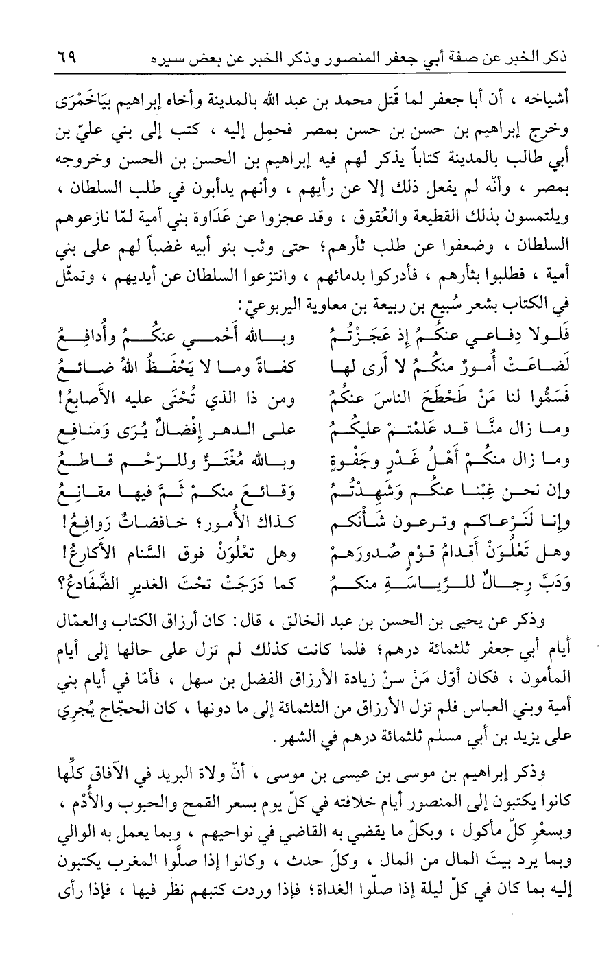 أشياخه، أن أبا جعفر لما قَتل محمَّد بن عبد الله بالمدينة وأخاه إبراهيم بيَاخَمْرَى وخرج إبراهيم بن حسن بن حسن بمصر فحمِل إليه، كتب إلى بني عليّ بن أبي طالب بالمدينة كتابًا يذكر لهم فيه إبراهيم بن الحسن بن الحسن وخروجه بمصر، وأنّه لم يفعل ذلك إلَّا عن رأيهم، وأنهم يدأبون في طلب السلطان، ويلتمسون بذلك القطيعة والعُقوق، وقد عجزوا عن عَدَاوة بني أميَّة لمّا نازعوهم السلطان، وضعفوا عن طلب ثأرهم؛ حتَّى وثب بنو أبيه غضبًا لهم على بني أميَّة، فطلبوا بثأرهم، فأدركوا بدمائهم، وانتزعوا السلطان عن أيديهم، وتمثّل في الكتاب بشعر سُبيع بن ربيعة بن معاوية اليربوعيّ:
