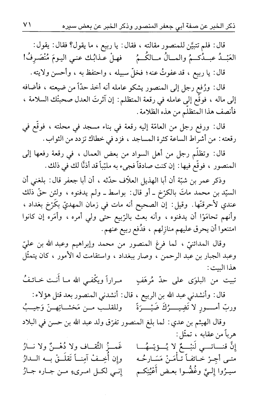 قال: فلم تتبيَّن للمنصور مقالته، فقال: يا ربيع، ما يقول؟ فقال: يقول: