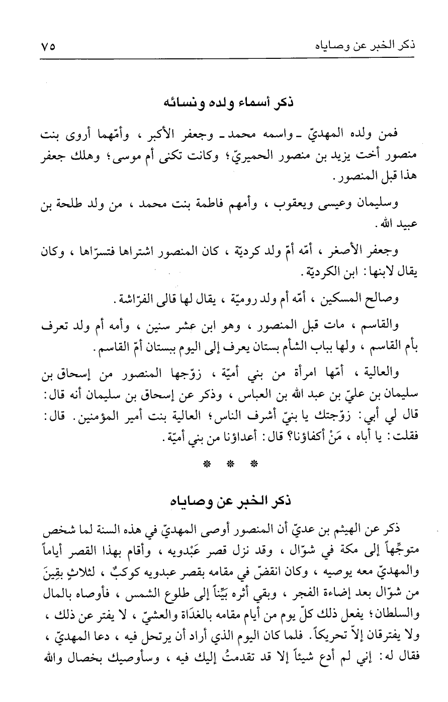 ذكر عن الهيثم بن عديّ أن المنصور أوصى المهديّ في هذه السنة لما شخص متوجِّهًا إلى مكّة في شوّال، وقد نزل قصر عَبْدويه، وأقام بهذا القصر أيامًا والمهديّ معه يوصيه، وكان انقضّ في مقامه بقصر عبدويه كوكب، لثلاثٍ بقِينَ من شوّال بعد إضاءة الفجر، وبقي أثره بيِّنًا إلى طلوع الشَّمس، فأوصاه بالمال والسلطان؛ يفعل ذلك كلّ يوم من أيَّام مقامه بالغدَاة والعشيّ، لا يفتر عن ذلك، ولا يفترقان إلّا تحريكًا. فلما كان اليوم الذي أراد أن يرتحل فيه، دعا المهديّ، فقال له: إنِّي لم أدع شيئًا إلَّا قد تقدمتُ إليك فيه، وسأوصيك بخصال والله