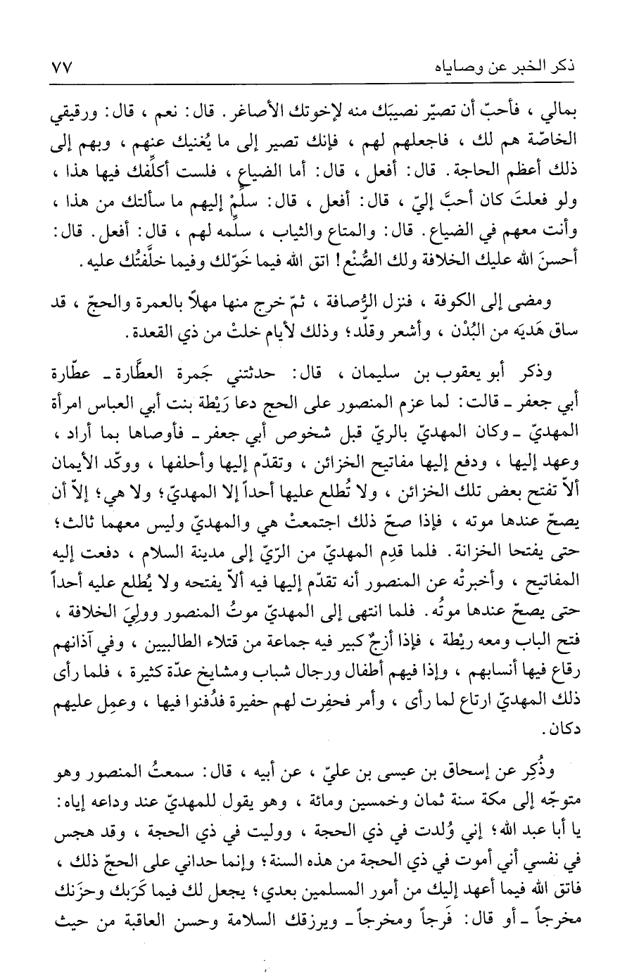 وذُكِر عن إسحاق بن عيسى بن عليّ، عن أبيه، قال: سمعتُ المنصور وهو متوجّه إلى مكّة سنة ثمان وخمسين ومائة، وهو يقول للمهديّ عند وداعه إياه: يا أبا عبد الله؛ إنِّي وُلدت في ذي الحجة، ووليت في ذي الحجة، وقد هجس في نفسي أني أموت في ذي الحجة من هذه السنة؛ وإنَّما حداني على الحجّ ذلك، فاتق الله فيما أعهد إليك من أمور المسلمين بعدي؛ يجعل لك فيما كَرَبك وحزَنك مخرجًا - أو قال: فَرجًا ومخرجًا - ويرزقك السلامة وحسن العاقبة من حيث