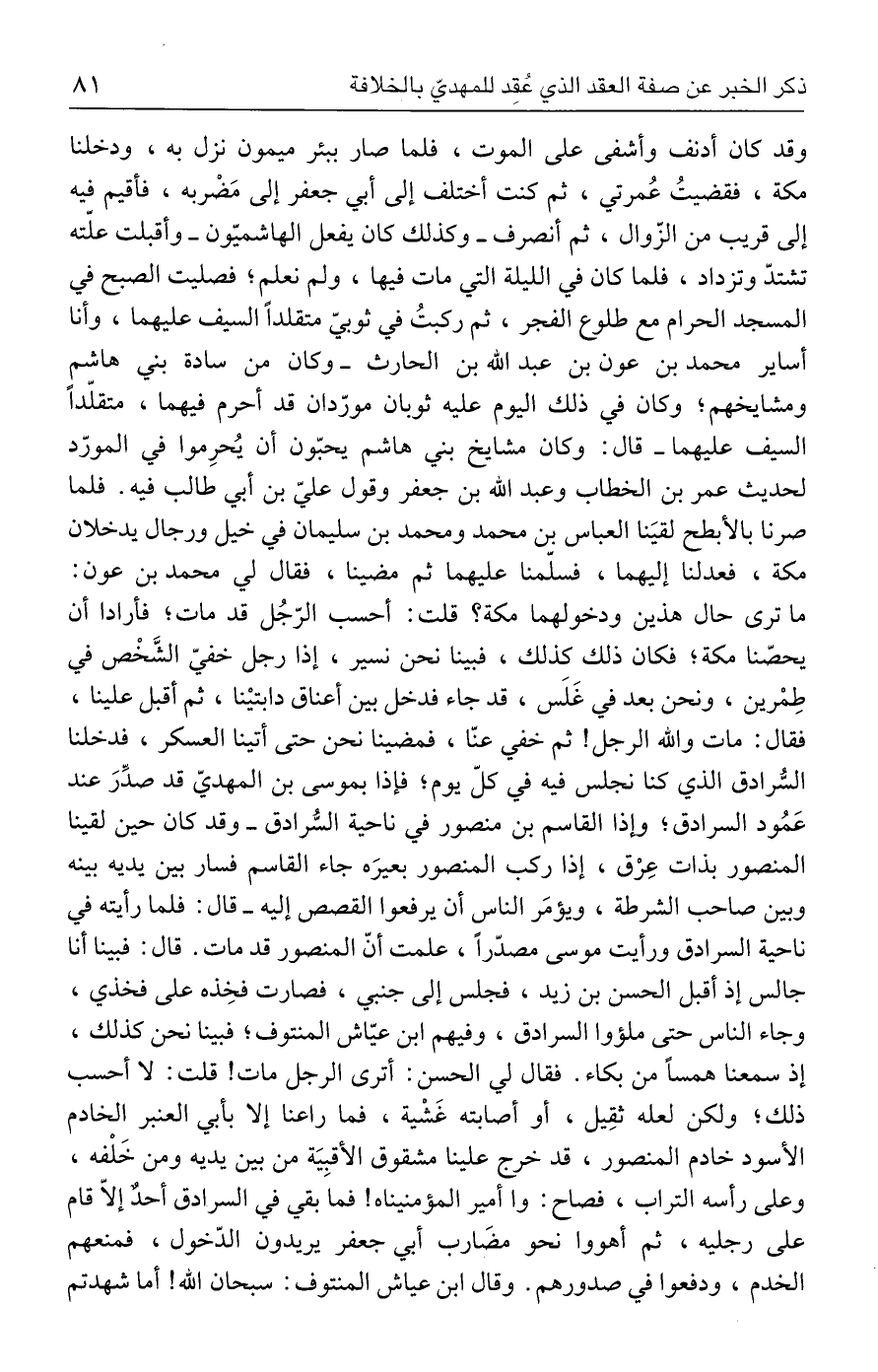 وقد كان أدنف وأشفى على الموت، فلما صار ببئر ميمون نزل به، ودخلنا مكّة، فقضيتُ عُمرتي، ثم كنت اختلف إلى أبي جعفر إلى مَضْربه، فأقيم فيه إلى قريب من الزّوال، ثم أنصرف - وكذلك كان يفعل الهاشميّون - وأقبلت علّته تشتدّ وتزداد، فلما كان في الليلة التي مات فيها، ولم نعلم؛ فصليت الصبح في المسجد الحرام مع طلوع الفجر، ثم ركبتُ في ثوبيّ متقلدًا السيف عليهما، وأنا أساير محمَّد بن عون بن عبد الله بن الحارث - وكان من سادة بني هاشم ومشايخهم؛ وكان في ذلك اليوم عليه ثوبان مورّدان قد أحرم فيهما، متقلّدًا السيف عليهما - قال: وكان مشايخ بني هاشم يحبّون أن يُحرِموا في المورّد لحديث عمر بن الخطاب وعبد الله بن جعفر وقول عليّ بن أبي طالب فيه. فلما صرنا بالأبطح لقيَنا العباس بن محمَّد ومحمد بن سليمان في خيل ورجال يدخلان مكّة، فعدلنا إليهما، فسلّمنا عليهما ثم مضينا، فقال لي محمَّد بن عون: ما ترى حال هذين ودخولهما مكّة؟ قلت: أحسب الرّجُل قد مات؛ فأرادا أن يحصّنا مكّة؛ فكان ذلك كذلك، فبينا نحن نسير، إذا رجل خفيّ الشَّخْص في طِمْرين، ونحن بعد في غَلَس، قد جاء فدخل بين أعناق دابتيْنا، ثم أقبل علينا، فقال: مات والله الرجل! ثم خفي عنا، فمضينا نحن حتَّى أتينا العسكر، فدخلنا السرادق الذي كُنَّا نجلس فيه في كلّ يوم؛ فإذا بموسى بن المهديّ قد صدِّرَ عند عَمُود السرادق؛ وإذا القاسم بن منصور في ناحية السّرادق - وقد كان حين لقينا المنصور بذات عِرْق، إذا ركب المنصور بعيرَه جاء القاسم فسار بين يديه بينه وبين صاحب الشرطة، ويؤمَر النَّاس أن يرفعوا القصص إليه - قال: فلما رأيته في ناحية السرادق ورأيت موسى مصدّرًا، علمت أنّ المنصور قد مات. قال: فبينا أنا جالس إذ أقبل الحسن بن زيد، فجلس إلى جنبي، فصارت فخِذه على فخذي، وجاء النَّاس حتَّى ملؤوا السرادق، وفيهم ابن عيّاش المنتوف؛ فبينا نحن كذلك، إذ سمعنا همسًا من بكاء. فقال لي الحسن: أترى الرجل مات! قلت: لا أحسب ذلك؛ ولكن لعله ثقِيل، أو أصابته غَشْية، فما راعنا إلَّا بأبي العنبر الخادم الأسود خادم المنصور، قد خرج علينا مشقوق الأقبِيَة من بين يديه ومن خَلْفه، وعلى رأسه التُّراب، فصاح: وا أمير المؤمنيناه! فما بقي في السرادق أحدٌ إلّا قام على رجليه، ثم أهووا نحو مضَارب أبي جعفر يريدون الدّخول، فمنعهم الخدم، ودفعوا في صدورهم. وقال ابن عياش المنتوف: سبحان الله! أما شهدتم