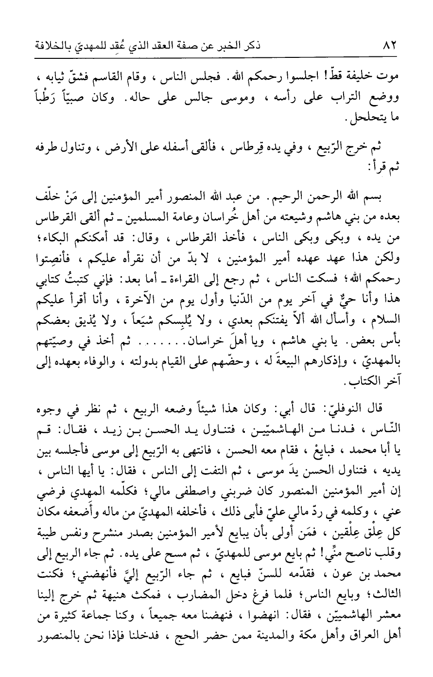 قال النوفليّ: قال أي: وكان هذا شيئًا وضعه الرَّبيع، ثم نظر في وجوه النّاس، فدنا من الهاشميّين، فتناول يد الحسن بن زيد، فقال: قم يا أبا محمَّد، فبايعْ، فقام معه الحسن، فانتهى به الرّبيع إلى موسى فأجلسه بين يديه، فتناول الحسن يدَ موسى، ثم التفت إلى النَّاس، فقال: يا أيها النَّاس، إن أمير المؤمنين المنصور كان ضربني واصطفى مالي؛ فكلّمه المهدي فرضي عني، وكلمه في ردّ مالي عليّ فأبى ذلك، فأخلفه المهديّ من ماله وأَضعفه مكان كل عِلْق عِلْقين، فمَن أولى بأن يبايع لأمير المؤمنين بصدر منشرح ونفس طيبة وقلب ناصح منِّي! ثم بايع موسى للمهديّ، ثم مسح على يده. ثم جاء الرَّبيع إلى محمَّد بن عون، فقدّمه للسنّ فبايع، ثم جاء الرّبيع إليَّ فأنهضني؛ فكنت الثالث؛ وبايع النَّاس؛ فلما فرغ دخل المضارب، فمكث هنيهة ثم خرج إلينا معشر الهاشمييّن، فقال: انهضوا، فنهضنا معه جميعًا، وكنا جماعة كثيرة من أهل العراق وأهل مكّة والمدينة ممن حضر الحج، فدخلنا فإذا نحن بالمنصور