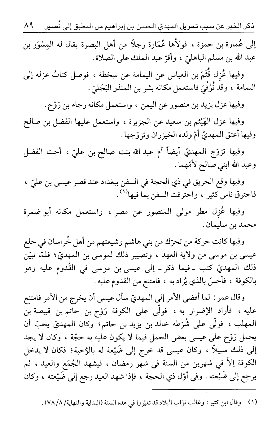 وفيها كانت حركة من تحرّك من بني هاشم وشيعتهم من أهل خُراسان في خلع عيسى بن موسى من ولاية العهد، وتصيير ذلك لموسى بن المهديّ؛ فلمَّا تبيّن ذلك المهديّ كتب - فيما ذكر - إلى عيسى بن موسى في القُدوم عليه وهو بالكوفة، فأحسّ بالذي يُراد به، فامتنع من القدوم عليه.