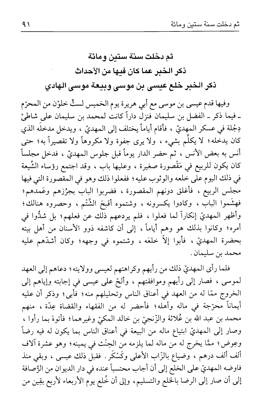 فلما رأى المهديّ ذلك من رأيهم وكراهتهم لعيسى وولايته؛ دعاهم إلى العهد لموسى، فصار إلى رأيهم وموافقتهم، وألحّ على عيسى في إجابته وإياهم إلى الخروج ممّا له من العهد في أعناق النَّاس وتحليلهم منه؛ فأبى؛ وذكر أن عليه أيمانًا محرّجة في ماله وأهله؛ فأحضر له من الفقهاء والقضاة عِدّة، منهم محمَّد بن عبد الله بن عُلاثة والزّنجيّ بن خالد المكيّ وغيرهما؛ فأتوهْ بما رأوا، وصار إلى المهديّ ابتياع ماله من البيعة في أعناق النَّاس بما يكون له فيه رضًا وعِوض؛ ممَّا يخرج له من ماله لما يلزمه من الحِنْث في يمينه؛ وهو عشرة آلاف ألف ألف درهم، وضياع بالزّاب الأعلى وكَسْكَر. فقبل ذلك عيسى، وبقي منذ فاوضه المهديّ على الخلع إلى أن أجاب محتسبًا عنده في دار الديوان من الرُّصافة إلى أن صار إلى الرضا بالخلع والتسليم، وإلى أن خُلع يوم الأربعاء لأربع بقِين من