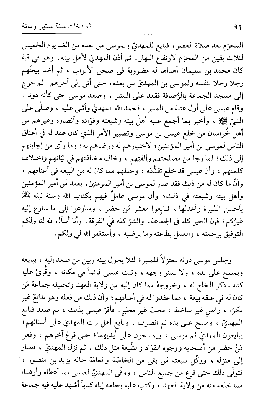 المحرّم بعد صلاة العصر، فبايع للمهديّ ولموسى من بعده من الغد يوم الخميس لثلاث بقين من المحرّم لارتفاع النهار. ثم أذن المهديّ لأهل بيته، وهو في قبة كان محمَّد بن سليمان أهداها له مضروبة في صحن الأبواب، ثم أخذ بيعتَهم رجلًا رجلًا لنفسه ولموسى بن المهديّ من بعده؛ حتَّى أتى إلى آخرهم. ثم خرج إلى مسجد الجماعة بالرُّصافة فقعد على المنبر، وصعد موسى حتَّى كأنه دونه. وقام عيسى على أول عتبة من المنبر، محمَّد الله المهديُّ وأثنى عليه، وصلّى على النَّبيّ - صلى الله عليه وسلم -، وأخبر بما أجمع عليه أهلُ بيته وشيعته وقوّاده وأنصاره وغيرهم من أهل خُراسان من خلع عيسى بن موسى وتصيير الأمر الذي كان عقد له في أعناق النَّاس لموسى بن أمير المؤمنين؛ لاختيارهم له ورضاهم به؛ وما رأى من إجابتهم إلى ذلك؛ لما رجا من مصلحتهم وألفتِهم، وخاف مخالفتهم في نيّاتهم واختلاف كلمتهم، وأن عيسى قد خلع تقدُّمَه، وحللهم مما كان له من البيعة في أعناقهم، وأنّ ما كان له من ذلك فقد صار لموسى بن أمير المؤمنين، بعقد من أمير المؤمنين وأهل بيته وشيعته في ذلك؛ وأن موسى عامل فيهم بكتاب الله وسنة نبيّه - صلى الله عليه وسلم - بأحسن السّيرة وأعدلها، فبايِعوا معشر مَن حضر، وسارعوا إلى ما سارع إليه غيرُكم؛ فإن الخير كله في الجماعة، والشرّ كله في الفرقة. وأنا أسأل الله لنا ولكم التوفيق برحمته، والعمل بطاعته وما يرضيه، وأستغفر الله لي ولكم.