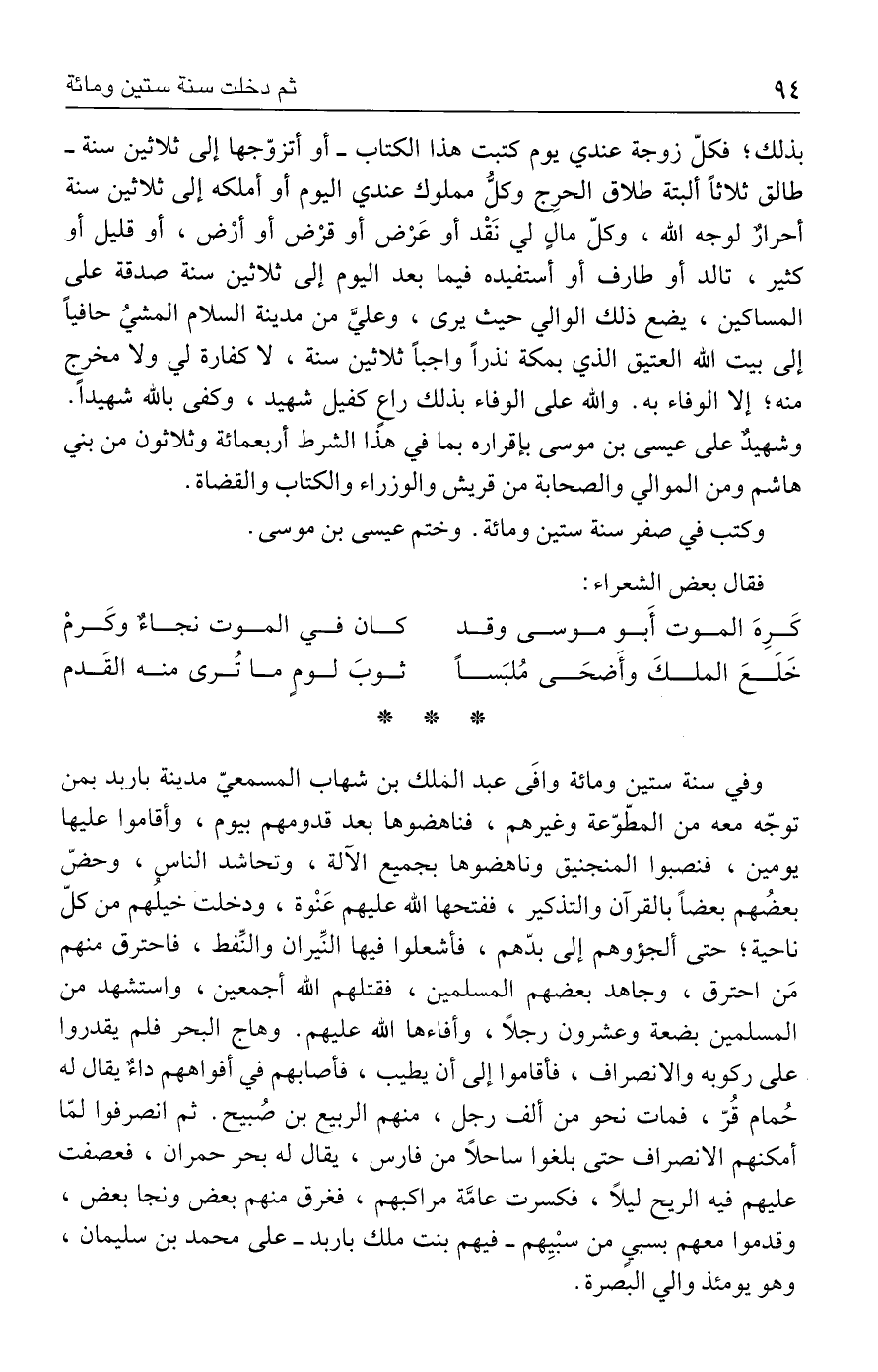 بذلك؛ فكلّ زوجة عندي يوم كتبت هذا الكتاب - أو أتزوّجها إلى ثلاثين سنة - طالق ثلاثًا ألبتة طلاق الحرِج وكلُّ مملوك عندي اليوم أو أملكه إلى ثلاثين سنة أحرار لوجه الله، وكلّ مالٍ لي نَقْد أو عَرْض أو قرْض أو أرْض، أو قليل أو كثير، تالد أو طارف أو أستفيده فيما بعد اليوم إلى ثلاثين سنة صدقة على المساكين، يضع ذلك الوالي حيث يرى، وعليَّ من مدينة السَّلام المشيُ حافيًا إلى بيت الله العتيق الذي بمكة نذرًا واجبًا ثلاثين سنة، لا كفارة لي ولا مخرج منه؛ إلَّا الوفاء به. والله على الوفاء بذلك راعٍ كفيل شهيد، وكفى بالله شهيدًا. وشهيدٌ على عيسى بن موسى بإقراره بما في هذا الشرط أربعمائة وثلاثون من بني هاشم ومن الموالي والصحابة من قريش والوزراء والكتاب والقضاة.