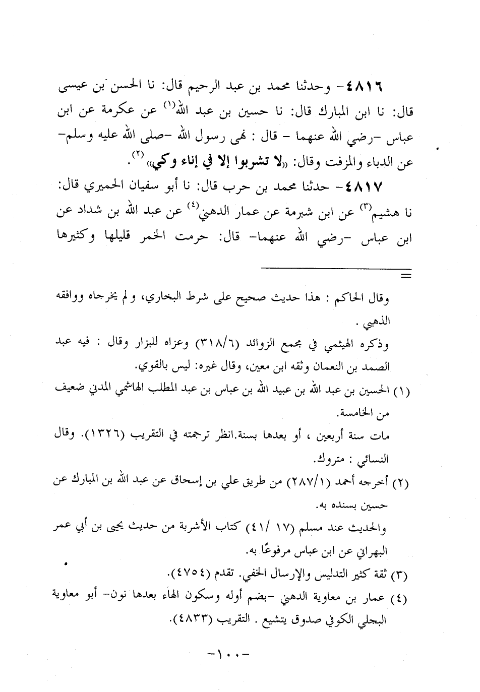 4817- حَدَّثنا مُحَمد بن حرب، قَال: حَدَّثنا أَبُو سُفيان الحميري، قَال: حَدَّثنا هُشَيْمٌ، عَن ابْنِ شُبْرُمَةَ عَنْ عَمَّارٍ الدُّهْنِيِّ عَنْ عَبد اللَّهِ بْنِ شَدَّادٍ، عَنِ ابْنِ عَبَّاسٍ، رَضِي اللَّهُ عَنْهُمَا، قَالَ: حُرِّمَتِ الْخَمْرُ قَلِيلُهَا وَكَثِيرُهَا وَالْمُسْكِرُ مِنْ كُلِّ شَرَابٍ.
