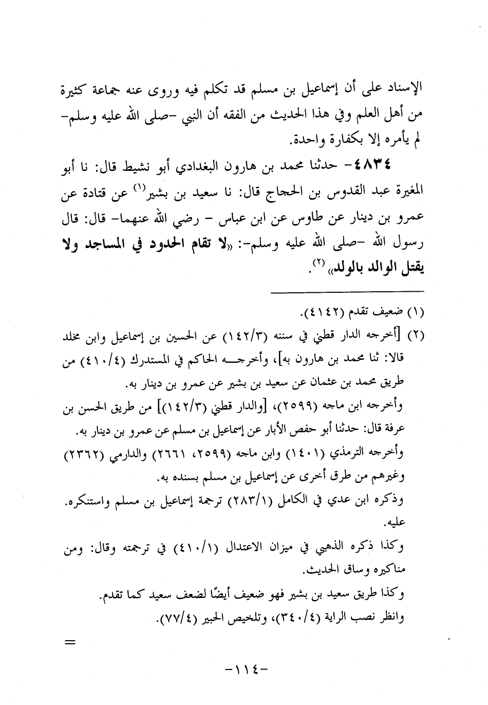 4834- حَدَّثنا مُحَمد بْنُ هَارُونَ الْبَغْدَادِيُّ أَبُو نُشَيْطٍ، قَال: حَدَّثنا أَبُو الْمُغِيرَةِ عَبد الْقُدُّوسِ بْنُ الْحَجَّاجِ، قَال: حَدَّثنا سَعِيد بْنُ بَشِيرٍ عَنْ قَتَادَةَ، عَن عَمْرو بن دِينار، عَن طاووس، عَنِ ابْنِ عَبَّاسٍ، رَضِي اللَّهُ عَنْهُمَا، قَالَ: قَالَ رَسُول اللهِ صَلَّى اللَّهُ عَلَيه وَسَلَّم: لا تُقَامُ الْحُدُودُ فِي الْمَسَاجِدِ، ولاَ يُقْتَلُ الْوَالِدُ بِالْوَلَدِ.