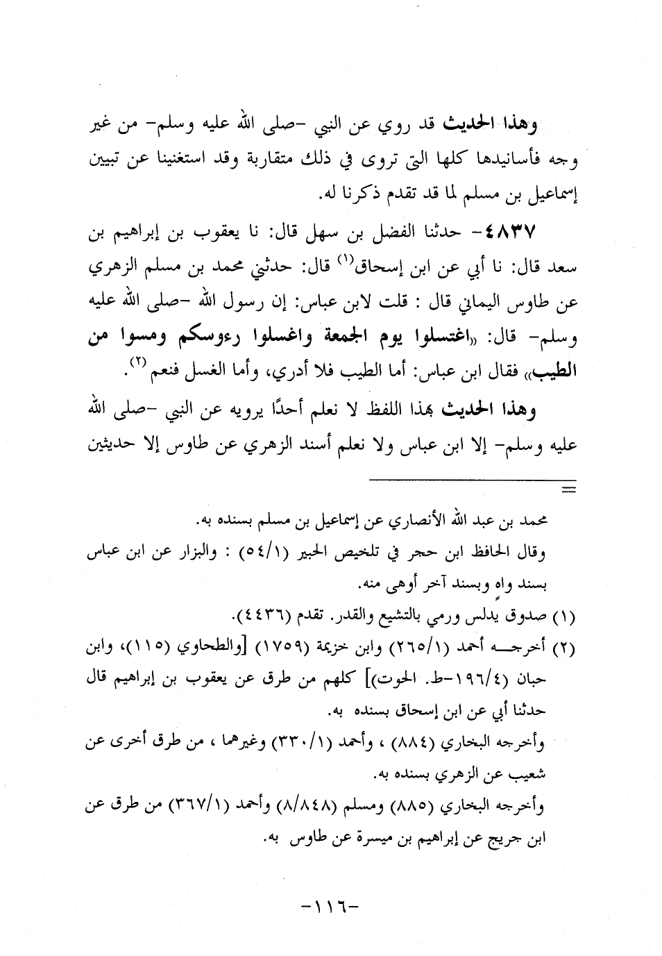 4837- حَدَّثنا الفضل بن سَهْل، قَال: حَدَّثنا يعقوب بن إبراهيم بن سَعْد، قَال: حَدَّثنا أَبِي، عَن ابْنِ إِسْحَاقَ قَالَ: حَدَّثَنِي مُحَمد بن مسلم الزُّهْرِيّ، عَنْ طَاوُوسٍ الْيَمَانِيِّ، قَالَ: قُلْتُ لاِبْنِ عَبَّاسٍ: إِنَّ رَسُولَ اللهِ صَلَّى اللَّهُ عَلَيه وَسَلَّم، قَالَ: اغْتَسِلُوا يَوْمَ الْجُمُعَةِ، وَاغْسِلُوا رُؤُوسَكُمْ، وَمَسُّوا مِنَ الطِّيبِ؟ فَقَالَ ابْنُ عَبَّاسٍ: أَمَّا الطِّيبُ فَلاَ أَدْرِي، وَأَمَّا الْغُسْلُ فَنَعَمْ.