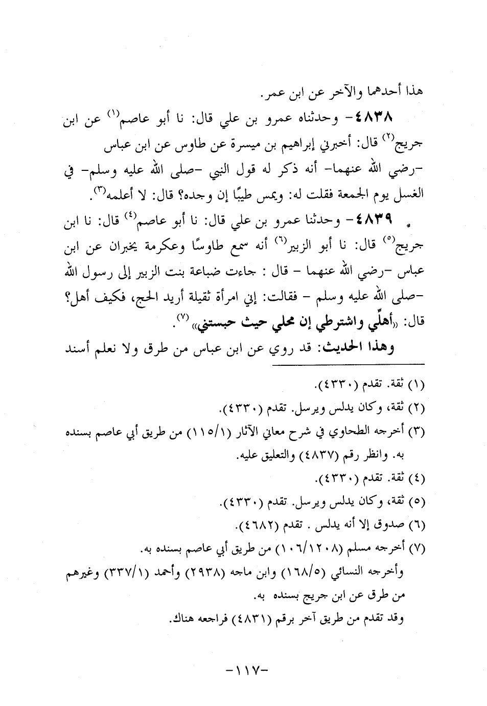 4838- وحَدَّثناه عَمْرو بن علي، قَال: حَدَّثنا أَبُو عَاصِم، عَن ابْنِ جُرَيج، قَال: أَخْبَرني إبراهيم بن ميسرة، عَن طاوُوس، عَنِ ابْنِ عَبَّاسٍ، رَضِي اللَّهُ عَنْهُمَا، أَنَّهُ ذَكَرَ لَهُ قَوْلَ النَّبِيّ صَلَّى اللَّهُ عَلَيه وَسَلَّم فِي الْغُسْلِ يَوْمَ الْجُمُعَةِ فَقُلْتُ لَهُ: وَيَمَسُّ طِيبًا إِنْ وَجَدَهُ؟ قَالَ: لا أَعْلَمُهُ.