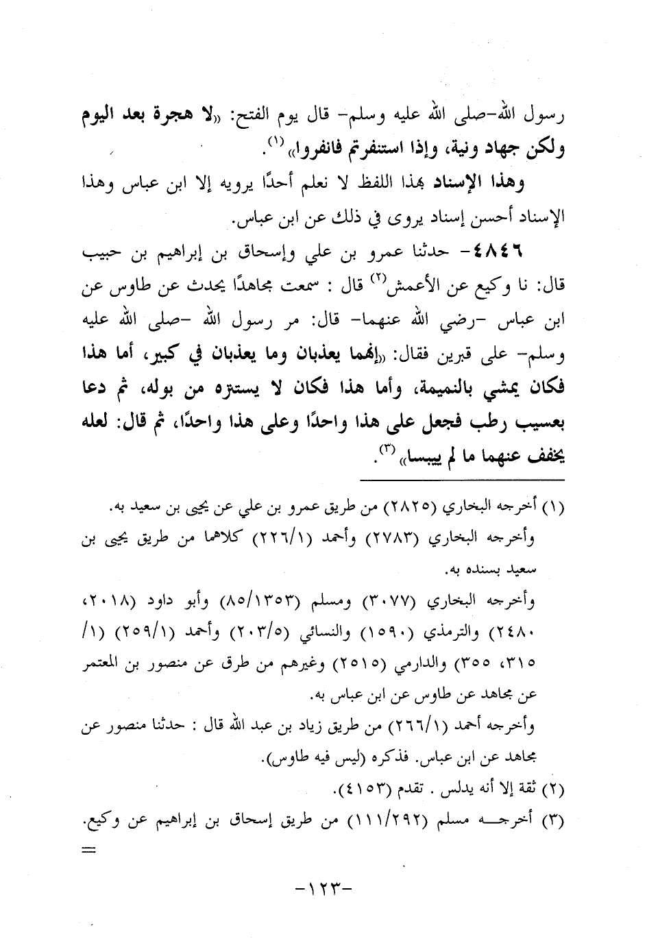 4846- حَدَّثنا عَمْرو بْنُ عَلِيٍّ، وَإسحاق بْنُ إِبْرَاهِيمَ بن حبيب، قَال: حَدَّثنا وَكِيعٌ عَنِ الأَعْمَشِ، قَالَ: سَمِعْتُ مُجَاهِدًا يُحَدِّثُ، عَن طاوُوس، عَنِ ابْنِ عَبَّاسٍ، رَضِي اللَّهُ عَنْهُمَا، قَالَ: مَرَّ رَسُولُ اللَّهِ صَلَّى اللَّهُ عَلَيه وَسَلَّم عَلَى قَبْرَيْنِ فَقَالَ: إِنَّهُمَا يُعَذَّبَانِ وَمَا يُعَذَّبَانِ فِي كَبِيرٍ أَمَّا هَذَا فَكَانَ يَمْشِي بِالنَّمِيمَةِ وَأَمَّا هَذَا فَكَانَ لا يَسْتَنْزِهُ مِنْ بَوْلِهِ، ثُمَّ دَعَا بِعَسِيبٍ رَطْبٍ فَجَعَل عَلَى هَذَا وَاحِدًا وَعَلَى هَذَا وَاحِدًا، ثُمَّ قَالَ: لَعَلَّهُ يُخَفِّفُ عَنْهُمَا مَا لَمْ يَيْبُسَا.