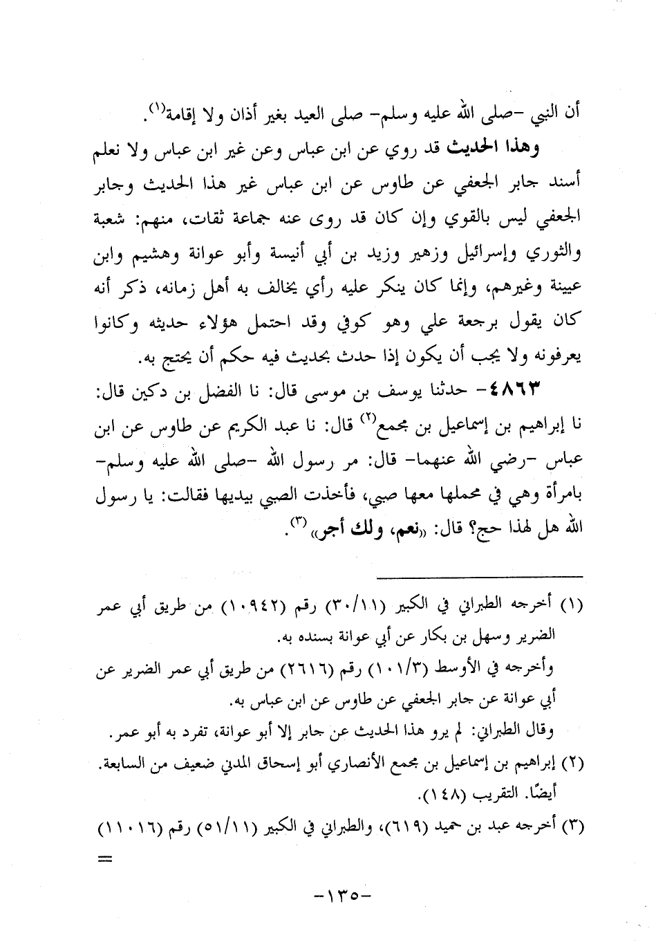 4863- حَدَّثنا يوسف بن موسى، قَال: حَدَّثنا الفضل بن دكين، قَال: حَدَّثنا إبراهيم بن إسماعيل بن مُجَمِّعٍ، قَال: حَدَّثنا عَبد الكريم، عَن طاوُوس، عَنِ ابْنِ عَبَّاسٍ، رَضِي اللَّهُ عَنْهُمَا، قَالَ: مَرَّ رَسُولُ اللَّهِ صَلَّى اللَّهُ عَلَيه وَسَلَّم بِامْرَأَةٍ وَهِيَ فِي مَحْمَلِهَا مَعَهَا صَبِيٌّ فَأَخَذَتِ الصَّبِيَّ بِيَدَيْهَا فَقَالَتْ: يَا رَسولَ اللهِ هَلْ لِهذَا حَجٌّ؟ قَالَ: نَعم، ولكَ أجْرٌ.