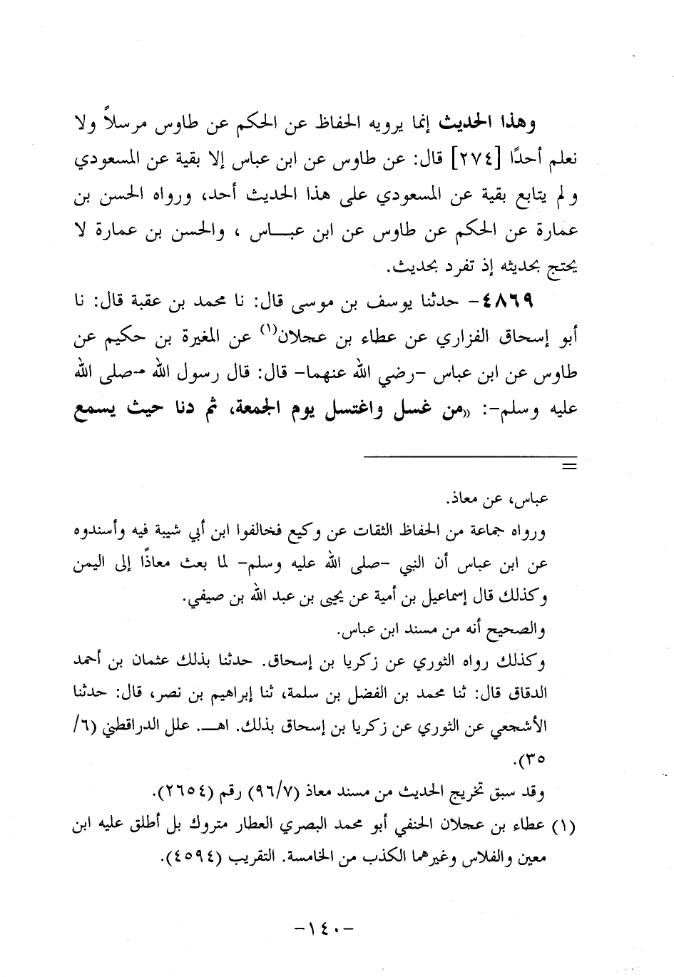 4869- حَدَّثنا يوسف بن موسى، قَال: حَدَّثنا مُحَمد بن عقبة، قَال: حَدَّثنا أَبُو إِسْحَاقَ الْفَزَارِيُّ، عَن عَطاء بْنِ عَجْلان عن المغيرة بن حكيم، عَن طاوُوس، عَنِ ابْنِ عَبَّاسٍ، رَضِي اللَّهُ عَنْهُمَا، قَالَ: قَالَ رَسُول اللهِ صَلَّى اللَّهُ عَلَيه وَسَلَّم: مَنْ غَسَلَ وَاغْتَسَلَ يَوْمَ الْجُمُعَةِ، ثُمَّ دَنَا حَيْثُ يَسْمَعُ خُطْبَةَ الإِمَامِ فَإِذَا خَرَجَ اسْتَمَعَ وَنَصَتَ حَتَّى يُصَلِّيَهَا مَعَهُ كُتِبَتْ لَهُ بِكُلِّ خُطْوَةٍ يَخْطُوهَا عِبَادَةُ سَنَةٍ قِيَامُهَا وَصِيَامُهَا.