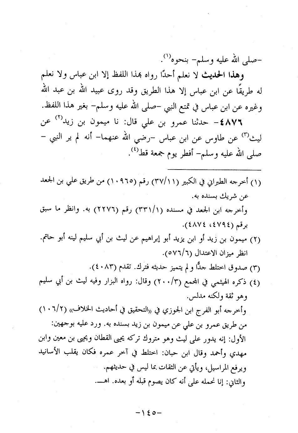 4876- حَدَّثنا عَمْرو بن علي، قَال: حَدَّثنا ميمون بن زيد، عَن ليث، عَن طاووس، عَنِ ابْنِ عَبَّاسٍ، رَضِي اللَّهُ عَنْهُمَا، أَنَّهُ لَمْ يَرَ النَّبِيّ صَلَّى اللَّهُ عَلَيه وَسَلَّم أَفْطَرَ يَوْمَ جُمُعَةٍ قَطُّ.