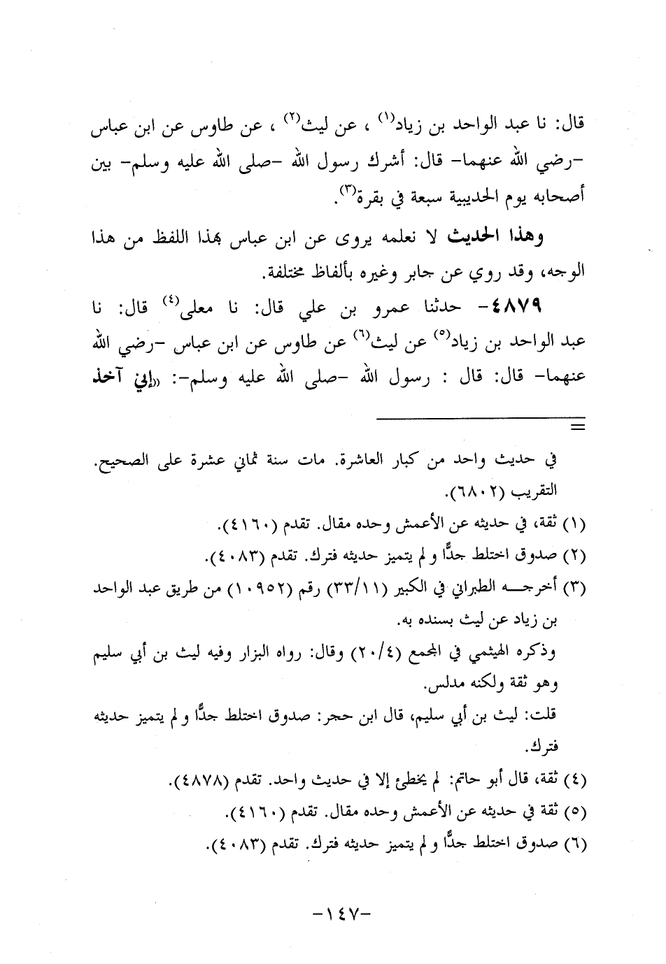 وَهَذَا الْحَدِيثُ لاَ نعلمُهُ يُرْوَى إلاَّ عَنِ ابْنِ عَبَّاسٍ بِهَذَا اللَّفْظِ، وَقَدِ اخْتَلَفُوا عَنْ لَيْثٍ فَرَوَاهُ غَيْرُ عَبد الْوَاحِدِ عَنْ لَيْثٍ، عَن عَبد الْمَلِكِ بْنِ سَعِيد بْنِ جُبَير، عَن أَبِيه، عَنِ ابْنِ عَبَّاسٍ، وَقَدْ رُوِيَ نَحْوُ كَلامِهِ عَنِ النَّبِيّ صَلَّى اللَّهُ عَلَيه وَسَلَّم مِنْ غَيْرِ وَجْهٍ، ولاَ نَعْلَمُ يُرْوَى عَن النَّبِيّ صَلَّى اللَّهُ عَلَيه وَسَلَّم هَذَا الْكَلامُ إلاَّ مِن هَذَا الْوَجْهِ.