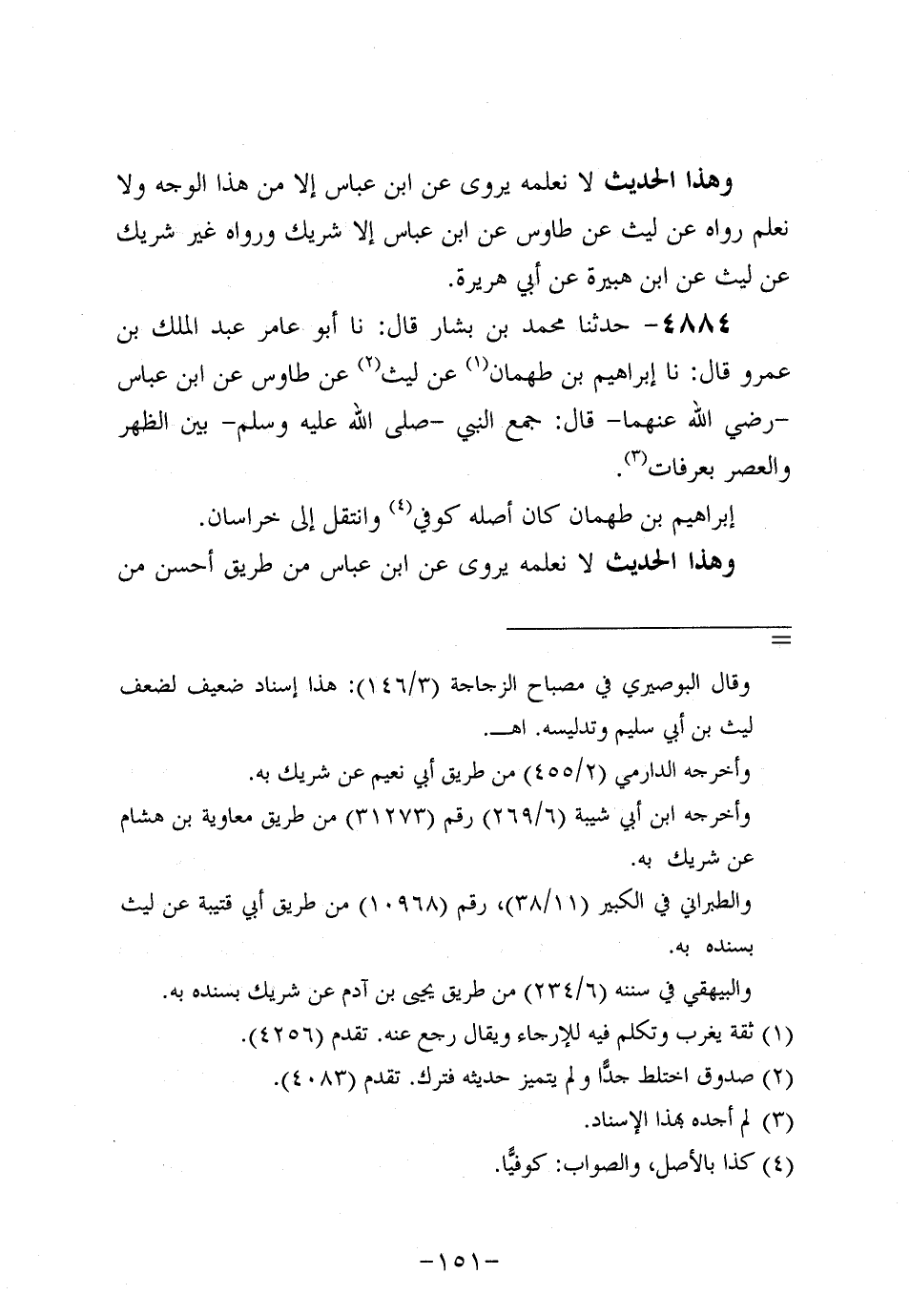 4884- حَدَّثنا مُحَمد بن بَشَّار، قَال: حَدَّثنا أَبُو عَامِرٍ عَبد الْمَلِكِ بْنُ عَمْرو، قَال: حَدَّثنا إبراهيم بن طهمان عن ليث، عَن طاووس، عَنِ ابْنِ عَبَّاسٍ، رَضِي اللَّهُ عَنْهُمَا، قَالَ: جَمَعَ النَّبِيّ صَلَّى اللَّهُ عَلَيه وَسَلَّم بَيْنَ الظُّهْرِ وَالْعَصْرِ بِعَرَفَاتٍ.