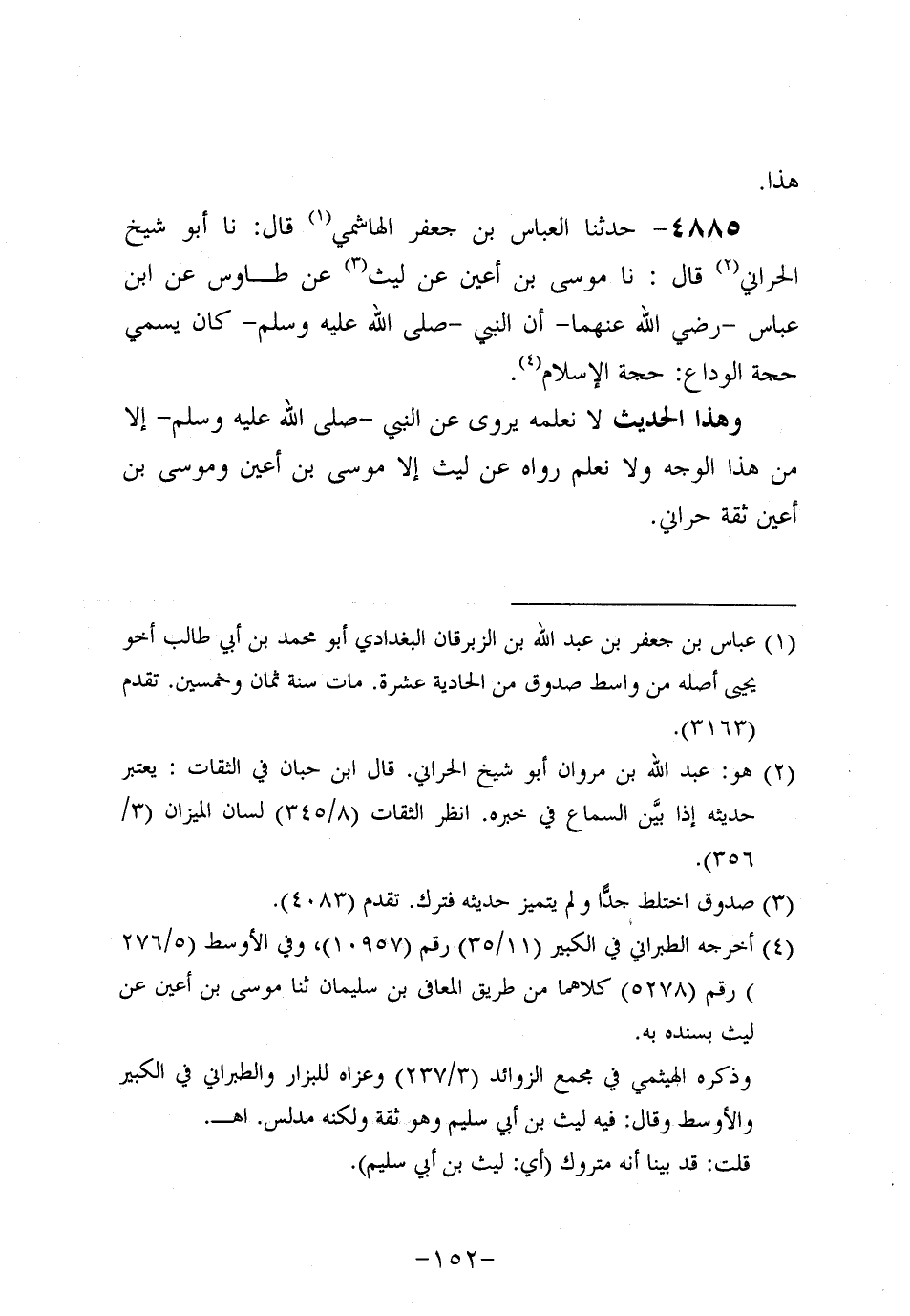 4885- حَدَّثنا العباس بن جعفر الهاشمي، قَال: حَدَّثنا أَبُو شيخ الحراني، قَال: حَدَّثنا موسى بن أعين عن ليث، عَن طاووس، عَنِ ابْنِ عَبَّاسٍ، رَضِي اللَّهُ عَنْهُمَا، أَنَّ النَّبيَّ صَلَّى اللَّهُ عَلَيه وَسَلَّم كَانَ يُسَمِّي حَجَّةَ الْوَدَاعِ: حَجَّةَ الإِسْلامِ.