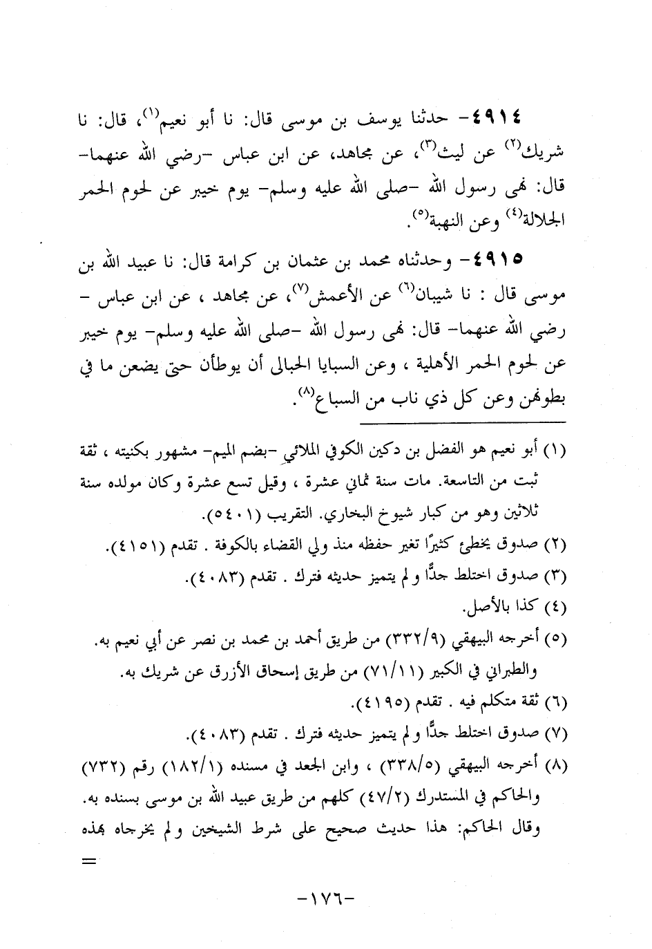 4914- حَدَّثنا يوسف بن موسى، قَال: حَدَّثنا أَبُو نعيم، قَال: حَدَّثنا شَرِيكٌ عَنْ لَيْثٍ، عَن مُجَاهِدٍ، عَنِ ابْنِ عَبَّاسٍ، رَضِي اللَّهُ عَنْهُمَا، قَالَ: نَهَى رَسُولُ اللهِ صَلَّى اللَّهُ عَلَيه وَسَلَّم يَوْمَ خَيْبَرَ عَنْ لُحُومِ الْحُمُرِ الْجَلالَةِ، وعَن النُّهْبَةِ.