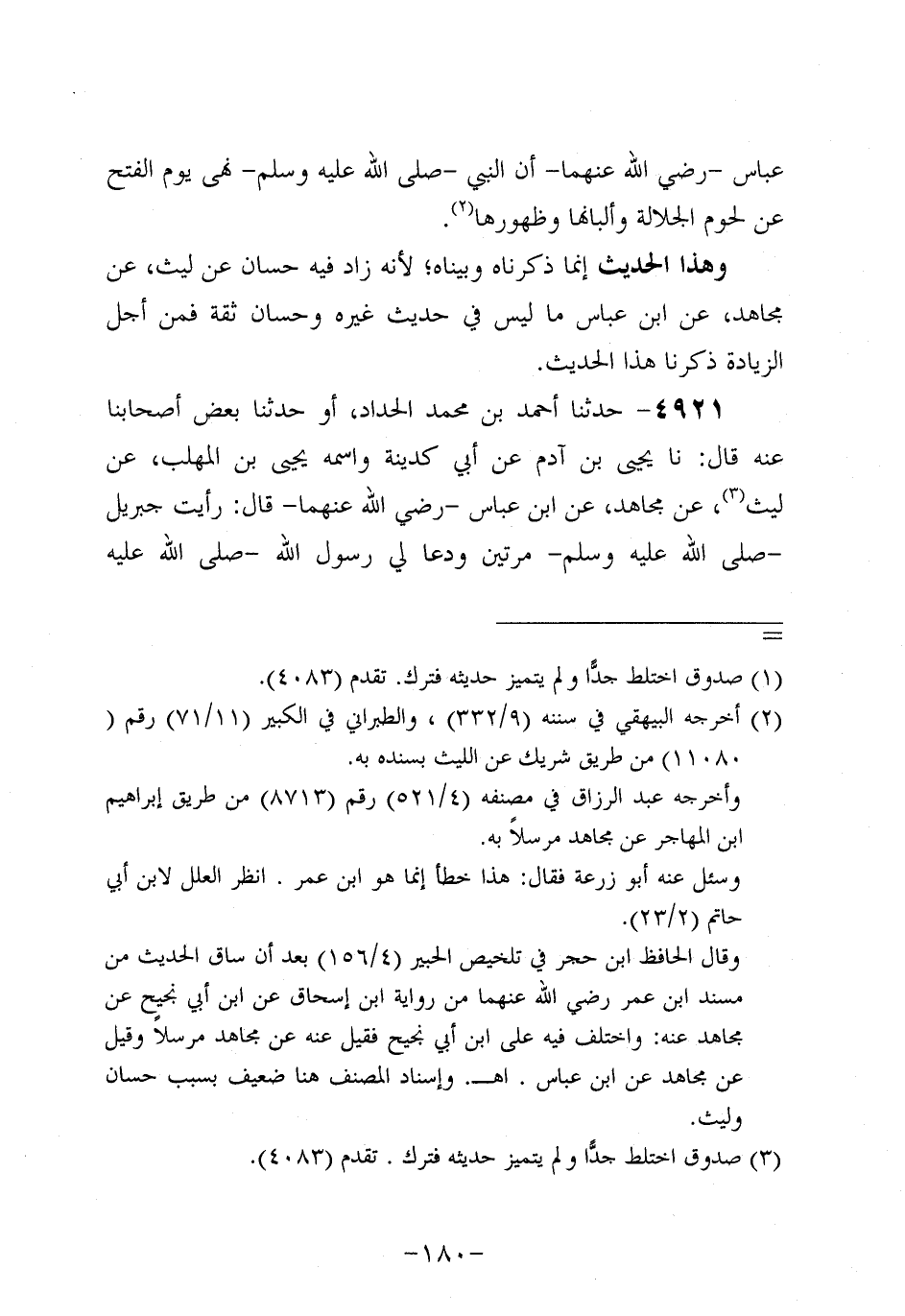 4921- حَدَّثنا أَحْمَدُ بْنُ مُحَمد الْحَدَّادُ، أَوْ حَدَّثنا بعض أصحابنا عنه، قَال: حَدَّثنا يَحْيَى بْنُ آدَمَ، عَن أَبِي كُدَيْنَةَ وَاسْمُهُ يَحْيَى بْنُ الْمُهَلَّبِ عَنْ لَيْثٍ، عَن مُجَاهِدٍ، عَنِ ابْنِ عَبَّاسٍ، رَضِي اللَّهُ عَنْهُمَا، قَالَ: رَأَيْتُ جِبْرِيلَ صَلَّى اللَّهُ عَلَيه وَسَلَّم مَرَّتَيْنِ ودعا لي رسول الله صلى اللَّهِ صَلَّى اللَّهُ عَلَيه وَسَلَّم بِالْحِكْمَةِ مَرَّتَيْنِ.
