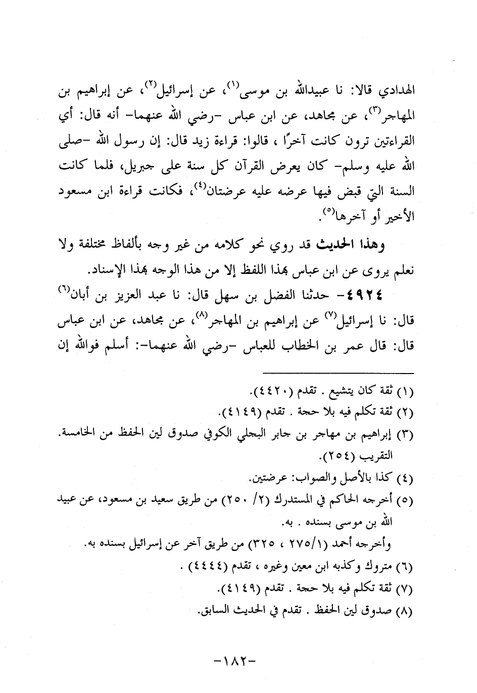 4924- حَدَّثنا الفضل بن سَهْل، قَال: حَدَّثنا عَبد العزيز بن أَبَان، قَال: حَدَّثنا إِسْرَائِيلَ، عَن إِبْرَاهِيمَ بْنِ الْمُهَاجِرِ، عَن مُجاهد، عَنِ ابْنِ عَبَّاسٍ قَالَ: قَالَ عُمَر بْنُ الْخَطَّابِ لِلْعَبَّاسِ، رَضِي اللَّهُ عَنْهُمَا: أَسْلِمْ فَوَاللَّهِ إِنْ تُسْلِمْ أَحَبُّ إليَّ مِنْ أَنْ يُسْلِمَ الْخَطَّابُ وَمَا ذَاكَ إلاَّ لأَنَّهُ كَانَ أَحَبَّ إِلَى رَسُولِ اللَّهِ صَلَّى اللَّهُ عَلَيه وَسَلَّم فَأَسْلِمْ يَكُنْ لَكَ سَبْقُكَ.