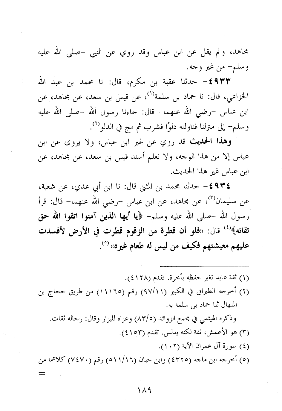 4934- حَدَّثنا مُحَمَّدُ بْنَ الْمُثَنَّى، قَال: حَدَّثنا ابْنُ أَبِي عَدِيّ عَنْ شُعبة، عَن سُلَيْمَانَ، عَن مُجاهد، عَنِ ابْنِ عَبَّاسٍ، رَضِي اللَّهُ عَنْهُمَا، قَالَ: قَرَأَ رَسُولُ اللَّهِ صَلَّى اللَّهُ عَلَيه وَسَلَّم {يَا أَيُّهَا الَّذِينَ آمَنُوا اتَّقُوا اللَّهَ حَقَّ تُقَاتِهِ} قَالَ: فَلَوْ أَنَّ قَطْرَةً مِنَ الزَّقُّومِ قُطِرَتْ فِي الأَرْضِ، لأفسدت عليهم معيشتهم , فَكَيْفَ بِمَنْ لَيْسَ لَهُ طَعَامٌ غَيْرُهُ