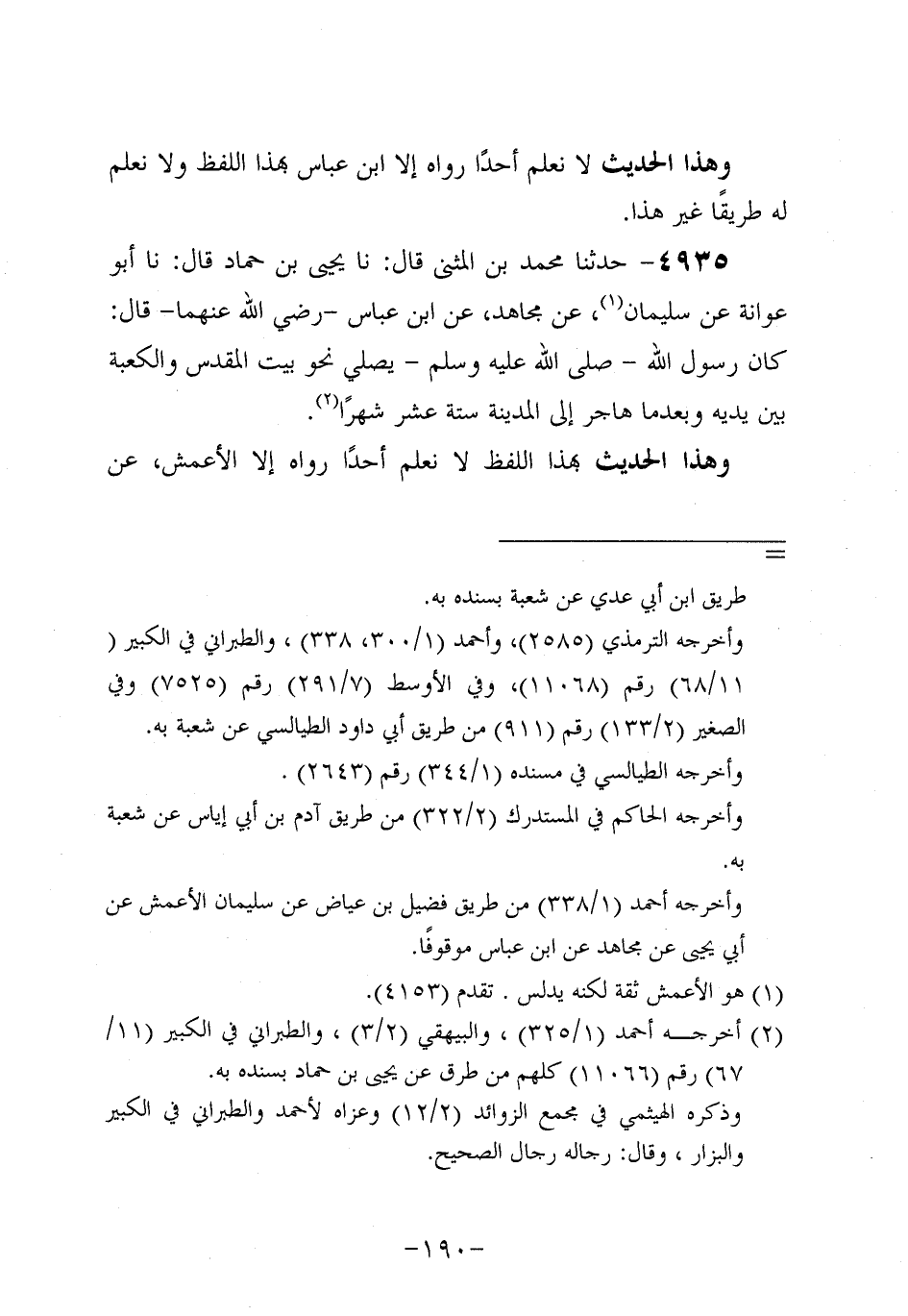 4935- حَدَّثنا مُحَمَّدُ بْنَ الْمُثَنَّى، قَال: حَدَّثنا يَحْيَى بن حماد، قَال: حَدَّثنا أَبُو عَوَانة، عَن سُلَيْمَانَ، عَن مُجاهد، عَنِ ابْنِ عَبَّاسٍ، رَضِي اللَّهُ عَنْهُمَا، قَالَ: كَانَ رَسُولُ اللَّهِ صَلَّى اللَّهُ عَلَيه وَسَلَّم يُصَلِّي نحو بيت المقدس والكعبة بين يديه وبعدما هَاجَرَ إِلَى الْمَدِينَةِ سِتَّةَ عَشَرَ شَهْرًا.