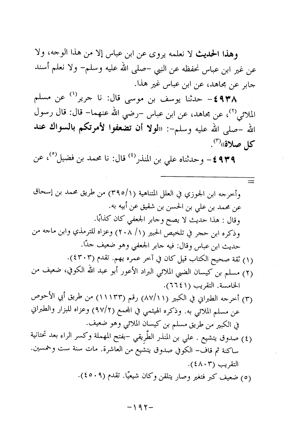 4938- حَدَّثنا يوسف بن موسى، قَال: حَدَّثنا جَرِير، عَن مُسْلِمٍ الْمُلائِيِّ، عَن مُجاهد، عَنِ ابْنِ عَبَّاسٍ، رَضِي اللَّهُ عَنْهُمَا، قَالَ: قَالَ رَسُول اللهِ صَلَّى اللَّهُ عَلَيه وَسَلَّم: لَوْلا أَنْ تَضْعُفُوا لأَمَرْتُكُمْ بِالسِّوَاكِ عِنْدَ كُلِّ صَلاةٍ.