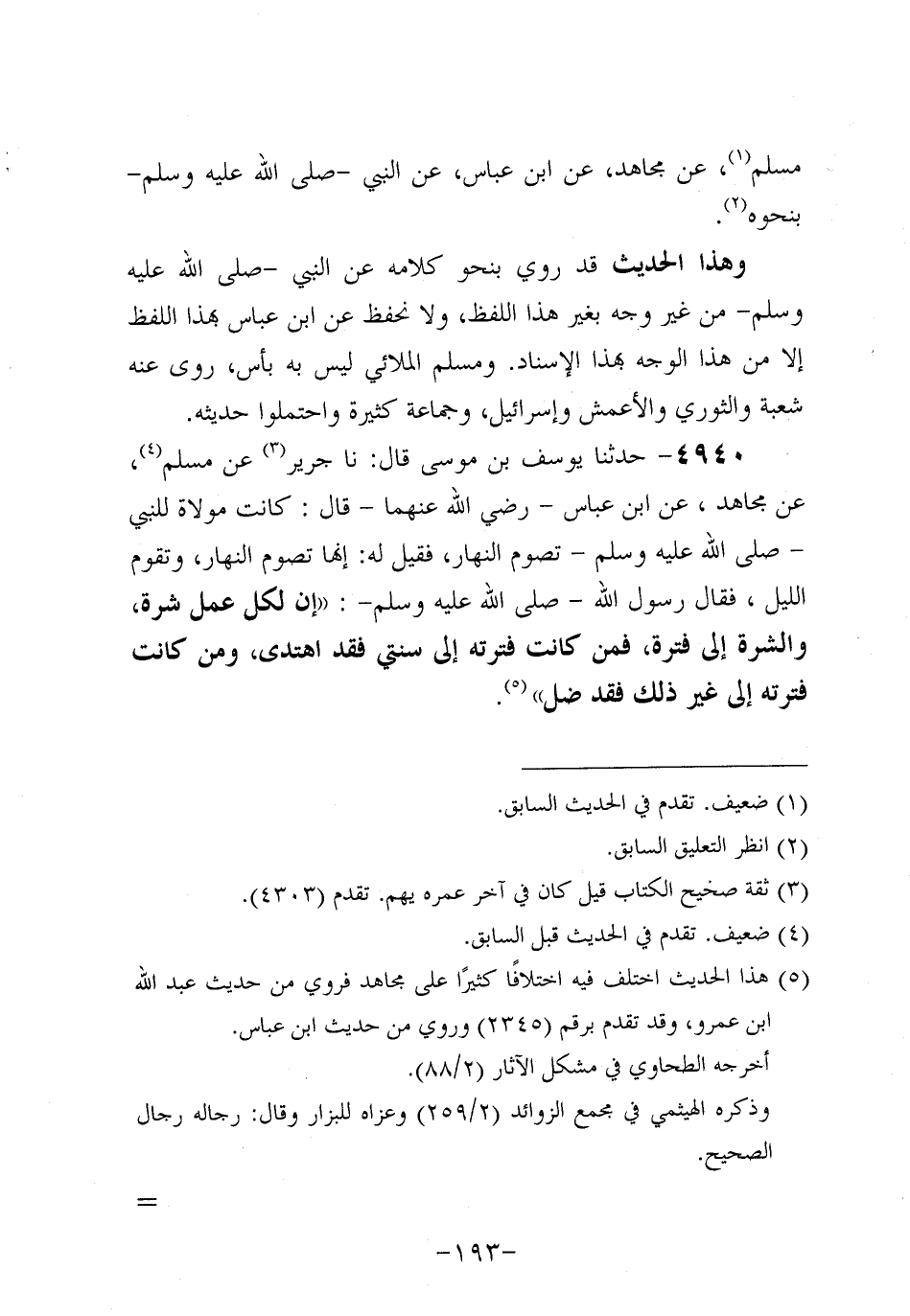 4940- حَدَّثنا يوسف بن موسى، قَال: حَدَّثنا جَرِير، عَن مُسْلِمٍ، عَن مُجاهد، عَنِ ابْنِ عَبَّاسٍ، رَضِي اللَّهُ عَنْهُمَا، قَالَ: كَانَتْ مَوْلاةٌ لِلنَّبِيِّ صَلَّى اللَّهُ عَلَيه وَسَلَّم تَصُومُ النَّهَارَ فَقِيلَ لَهُ إِنَّهَا تَصُومُ النَّهَارَ وَتَقُومُ اللَّيْلَ فَقَالَ رَسُولُ اللَّهِ صَلَّى اللَّهُ عَلَيه وَسَلَّم: إِنَّ لِكُلِّ عَمَلٍ شِرَّةً وَالشِّرَّةُ إِلَى فَتْرَةٍ فَمَنْ كَانَتْ فَتْرَتُهُ إِلَى سُنَّتِي فَقَدِ اهْتَدَى، وَمَنْ كَانَتْ فَتْرَتُهُ إِلَى غَيْرِ ذَلِكَ فَقَدْ ضَلَّ.