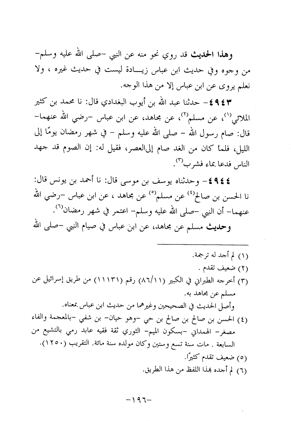 4943- حَدَّثنا عَبد اللَّهِ بْنُ أَيُّوبَ الْبَغدَادِيُّ، قَال: حَدَّثنا مُحَمد بُنْ كَثِيرٍ الْمُلائِيُّ عَنْ مُسْلِمٍ، عَن مُجاهد، عَنِ ابْنِ عَبَّاسٍ، رَضِي اللَّهُ عَنْهُمَا، قَالَ: صَامَ رَسُولُ اللَّهِ صَلَّى اللَّهُ عَلَيه وَسَلَّم فِي شَهْرِ رَمَضَانَ يَوْمًا إِلَى اللَّيْلِ فَلَمَّا كَانَ مِنَ الْغَدِ صَامَ إِلَى الْعَصْرِ فَقِيلَ لَهُ: إِنَّ الصَّوْمَ قَدْ جَهِدَ النَّاسَ فَدَعَا بِمَاءٍ فَشَرِبَ.