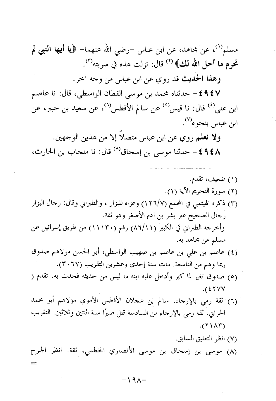 4948- حَدَّثنا موسى بن إسحاق، قَال: حَدَّثنا منجاب بن الحارث، قَال: حَدَّثنا عَلِيُّ بْنُ مُسْهِرٍ عَنْ مُسْلِمٍ، عَن مُجاهد، عَنِ ابْنِ عَبَّاسٍ فِي قَوْلِ اللَّهِ تَبَارَكَ وتعالى {واللاتي يأتين الفاحشة من نسائكم} قَالَ: كُنَّ يُحْبَسْنَ فِي الْبُيُوتِ حَتَّى يَمُتْنَ فَلَمَّا نَزَلَتْ سُورَةُ النُّورِ وَنَزَلَتِ الْحُدُودُ نَسَخَتْهَا.