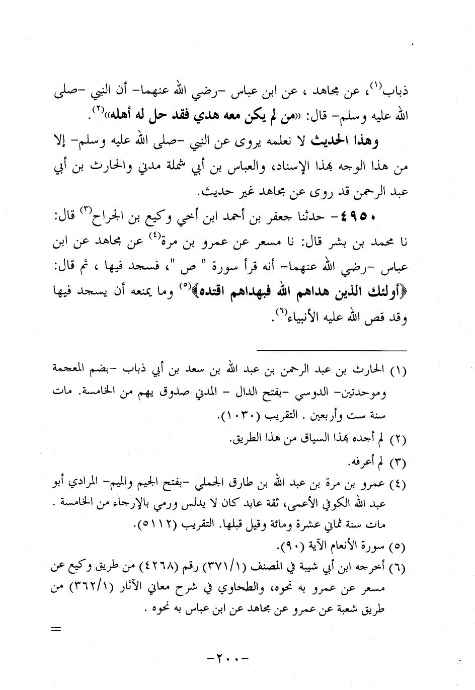 4950- حَدَّثنا جَعْفَرُ بْنُ أَحْمَدَ ابْنُ أَخِي وَكِيعِ بن الجراح، قَال: حَدَّثنا مُحَمد بن بشر، قَال: حَدَّثنا مِسْعَرٌ عَنْ عَمْرو بْنِ مُرَّةَ، عَن مُجاهد، عَنِ ابْنِ عَبَّاسٍ، رَضِي اللَّهُ عَنْهُمَا، أَنَّهُ قَرَأَ سُورَةَ (ص) فَسَجَدَ فِيهَا، ثُمَّ قَالَ: {أولئك الذين هداهم الله فبهداهم اقتده} وَمَا يَمْنَعُهُ أَنْ يَسْجُدَ فِيهَا، وَقَدْ قَصَّ اللَّهُ عَلَيْهِ الأَنْبِيَاءَ.