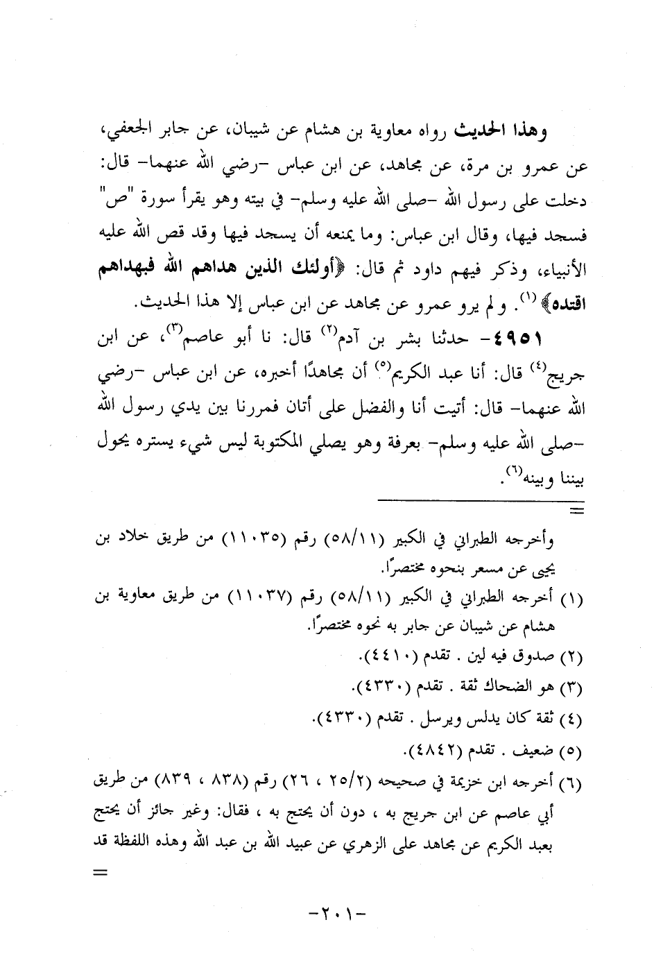 4951- حَدَّثنا بِشْر بن آدم، قَال: حَدَّثنا أَبُو عَاصِم، عَن ابن جُرَيج، قال: أَخْبَرنا عَبد الْكَرِيمِ، أنَّ مُجَاهِدًا أَخْبَرَهُ، عَنِ ابْنِ عَبَّاسٍ، رَضِي اللَّهُ عَنْهُمَا، قَالَ: أَتَيْتُ أَنَا وَالْفَضْلُ عَلَى أَتَانٍ، فَمَرَرْنَا بَيْنَ يَدَيْ رَسُولِ اللَّهِ صَلَّى اللَّهُ عَلَيه وَسَلَّم بِعَرَفَةَ، وهُو يُصَلِّي الْمَكْتُوبَةَ، لَيْسَ شَيْءٌ يَسْتُرُهُ يَحُولُ بَيْنَنَا وَبَيْنَهُ.