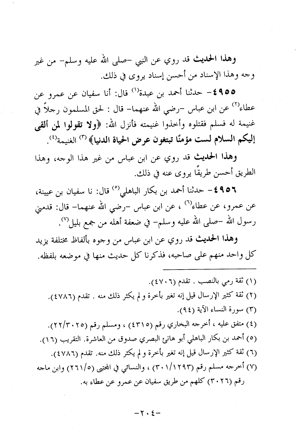4955- حَدَّثنا أحمد بن عَبدة، قال: أَخْبَرَنَا سُفيان، عَن عَمْرو، عَن عَطَاءٍ، عَنِ ابْنِ عَبَّاسٍ، رَضِي اللَّهُ عَنْهُمَا، قَالَ: لَحِقَ الْمُسْلِمُونَ رَجُلا فِي غُنَيْمَةٍ لَهُ، فَسَلَّمَ فَقَتَلُوهُ وَأَخَذُوا غُنَيمته، فَأَنْزَلَ اللَّهُ: {وَلاَ تَقُولُوا لِمَنْ أَلْقَى إِلَيْكُمُ السَّلاَمَ لَسْتَ مُؤْمِنًا تَبْتَغُونَ عَرَضَ الْحَيَاةِ الدُّنْيَا} : الغُنَيمة.