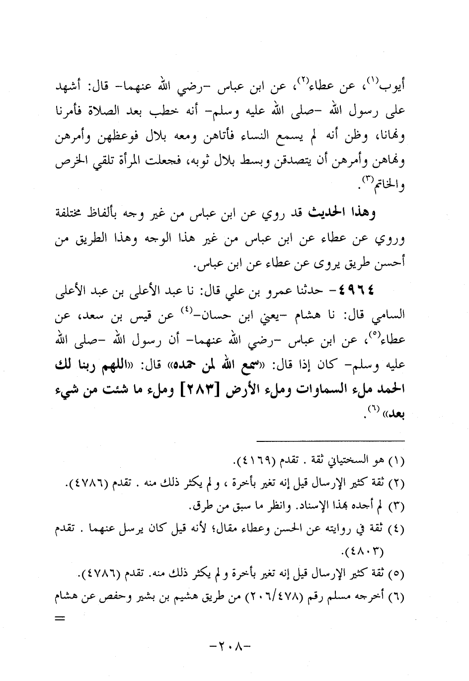 4964- حَدَّثنا عَمْرو بن علي، قَال: حَدَّثنا عَبد الأَعْلَى بْنُ عَبد الأَعْلَى السَّامِيُّ، قَال: حَدَّثنا هِشَامٌ، يَعْنِي ابْنَ حَسَّانٍ عَنْ قَيْسِ بْنِ سَعْد، عَن عَطاء، عَنِ ابْنِ عَبَّاسٍ، رَضِي اللَّهُ عَنْهُمَا، أَنَّ رَسُولَ اللهِ صَلَّى اللَّهُ عَلَيه وَسَلَّم كَانَ إِذَا قَالَ: سَمِعَ اللَّهُ لِمَنْ حَمِدَهُ قَالَ: اللَّهُمَّ رَبَّنَا لَكَ الْحَمْدُ ملء السماوات، ومِلءَ الأَرْضِ، ومِلءَ مَا شِئْتَ مِنْ شَيْءٍ بَعْدُ.