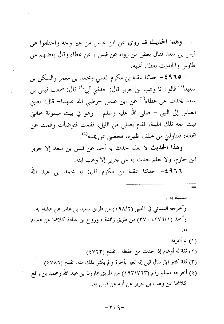 4965- حَدَّثنا عُقْبَةُ بْنُ مُكْرَمٍ الْعَمِّيُّ ومُحَمد بْنُ مَعْمَر والسكن بن سَعِيد قالوا: حَدَّثنا وَهْبُ بْنُ جَرِيرٍ قَالَ: حَدَّثَنِي أَبِي، قَالَ: سَمِعْتُ قَيْسَ بْنَ سَعْد يُحَدِّثُ، عَن عَطاء، عَنِ ابْنِ عَبَّاسٍ، رَضِي اللَّهُ عَنْهُمَا، قَالَ: بَعَثَنِي الْعَبَّاسُ إِلَى النَّبِيّ صَلَّى اللَّهُ عَلَيه وَسَلَّم، وهُو فِي بَيْتِ مَيْمُونَةَ خَالَتِي فَبِتُّ مَعَهُ تِلْكَ اللَّيْلَةِ فَقَامَ يُصَلِّي مِنَ اللَّيْلِ فَقُمْتُ فَتَوَضَّأْتُ وَقُمْتُ عَنْ شِمَالِهِ فَتَنَاوَلَنِي مِنْ خَلْفِ ظَهْرِهِ فَجَعَلَنِي عَنْ يَمِينِهِ.